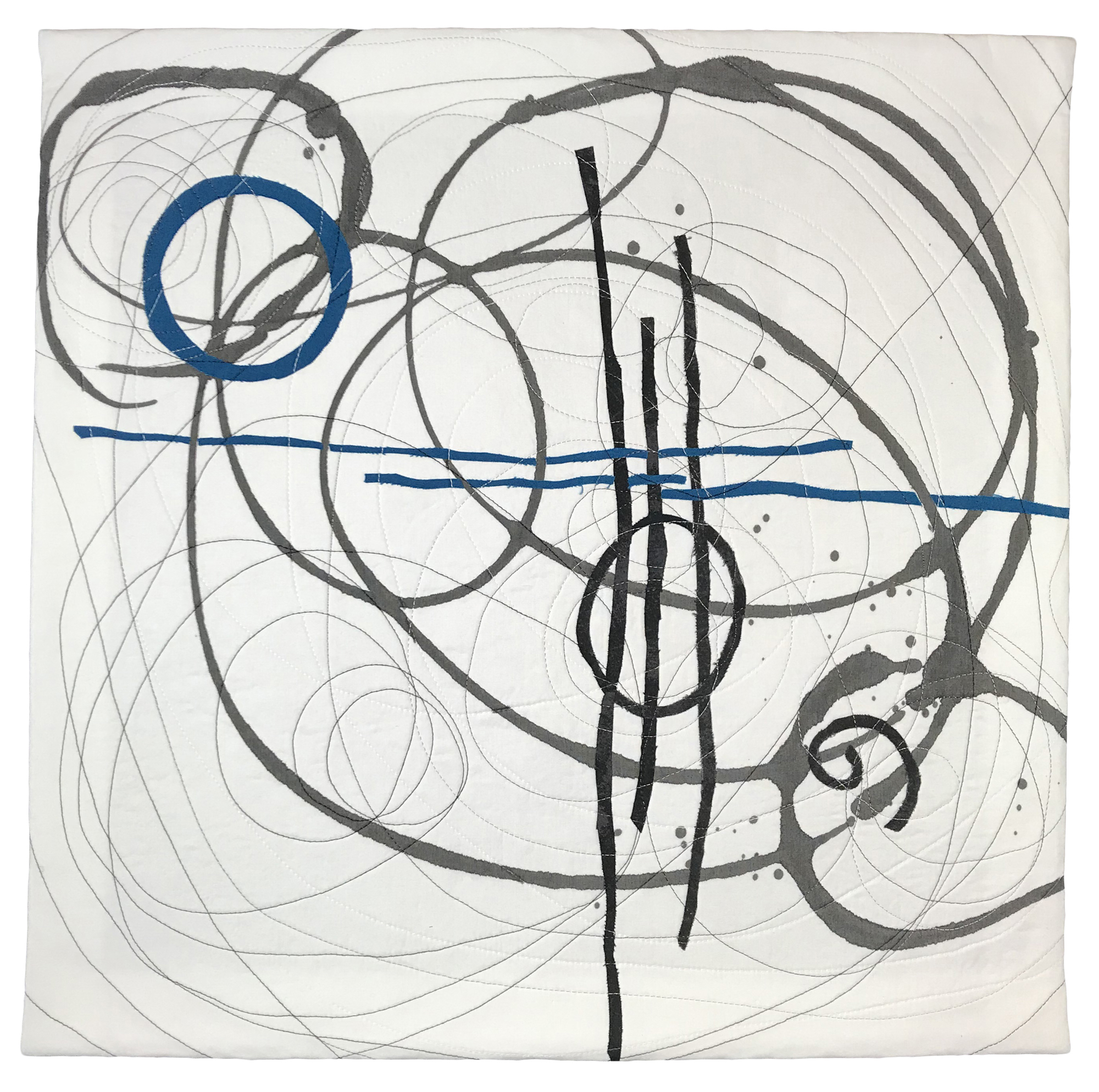 I love the gesture of flinging paint on fabric, watching the abstract images come to life. With the start of a gestural stroke of paint, my initial design is established. The serendipity of the paint pushes me to the next level. With the addition of circular shapes and a touch of color, the abstraction is complete. My abstraction is deliberate, hoping the viewer will find inspiration in my work.