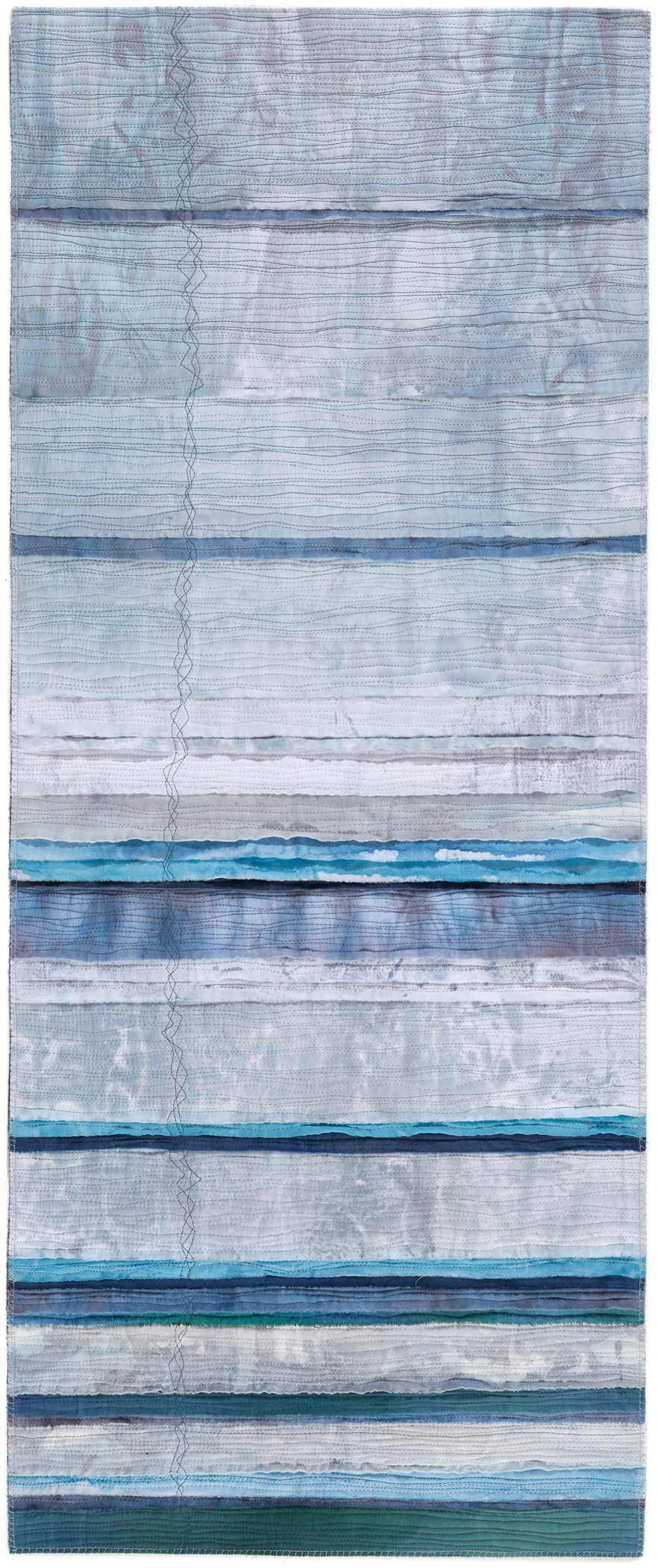 The arctic zone is on constant changes with the modification of the temperatures every year higher than the previous one. Since many years now, I feel greatly concerned by the impact of our way of life has on certain areas of the globe. This quilt is about the melting of the icebergs which lowers the ocean's temperatures and adds pure water to the oceans. Its long and narrow shape speaks of the highness of the icebergs and the broken quilted lines figure the unfortunately expected break of one huge iceberg into several smaller ones.