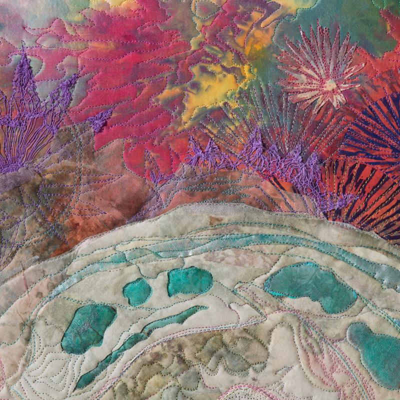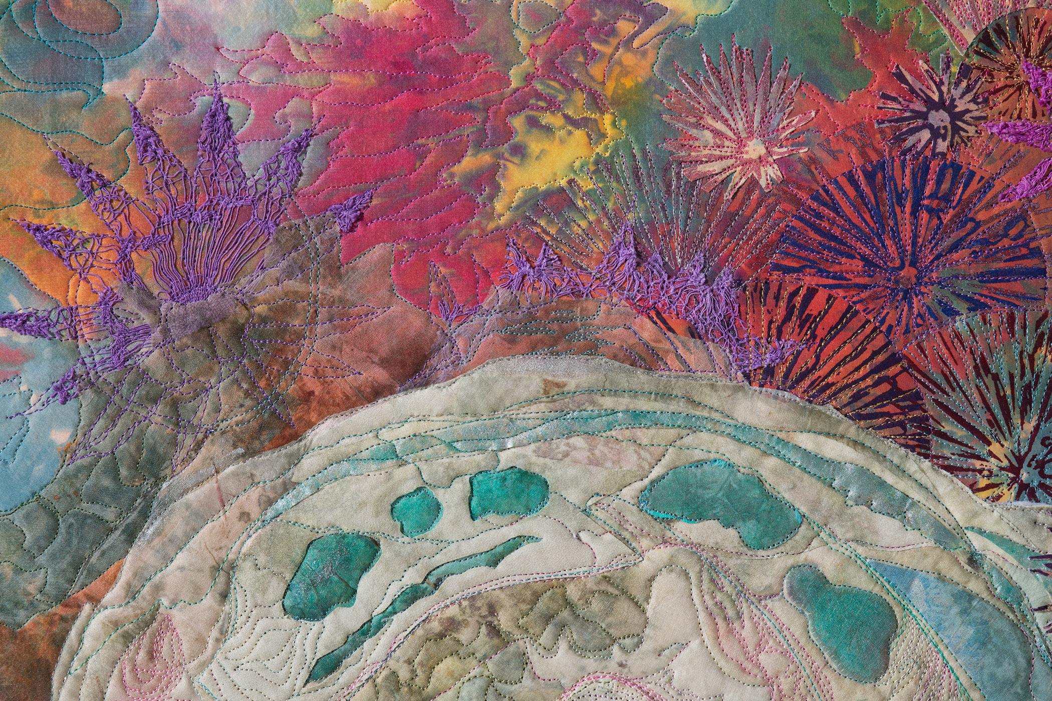 Through art, I choose to alert my viewer about harm caused to our fellow human beings and to our planet. Along the California Coast, abalone survival is in danger. Their food source, bull kelp, has collapsed, devoured by the proliferation of purple sea urchins. Global warming has triggered a complex sequence of consequences, leading to this alert. Marine scientists are urgently working to re-establish the bio-health of coastal marine life. Quilted by Angie Woolman.