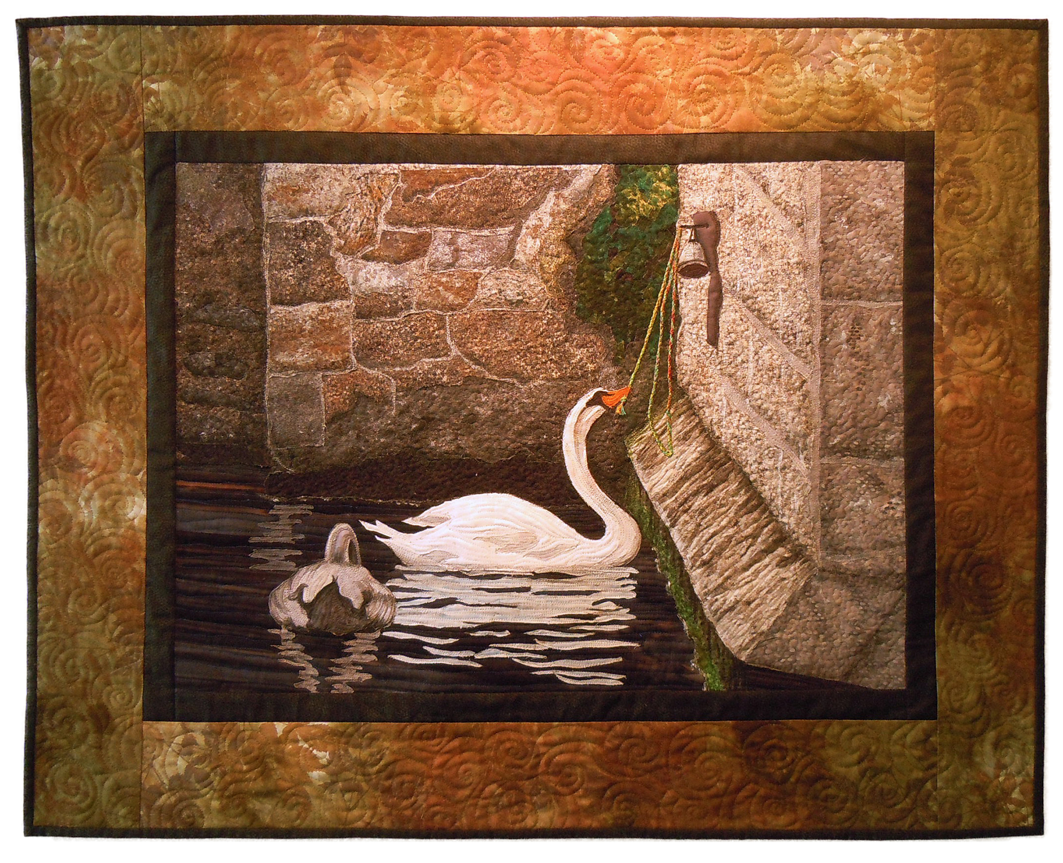 Fused, raw edge appliquéd, painted, couched, free motion quilted.