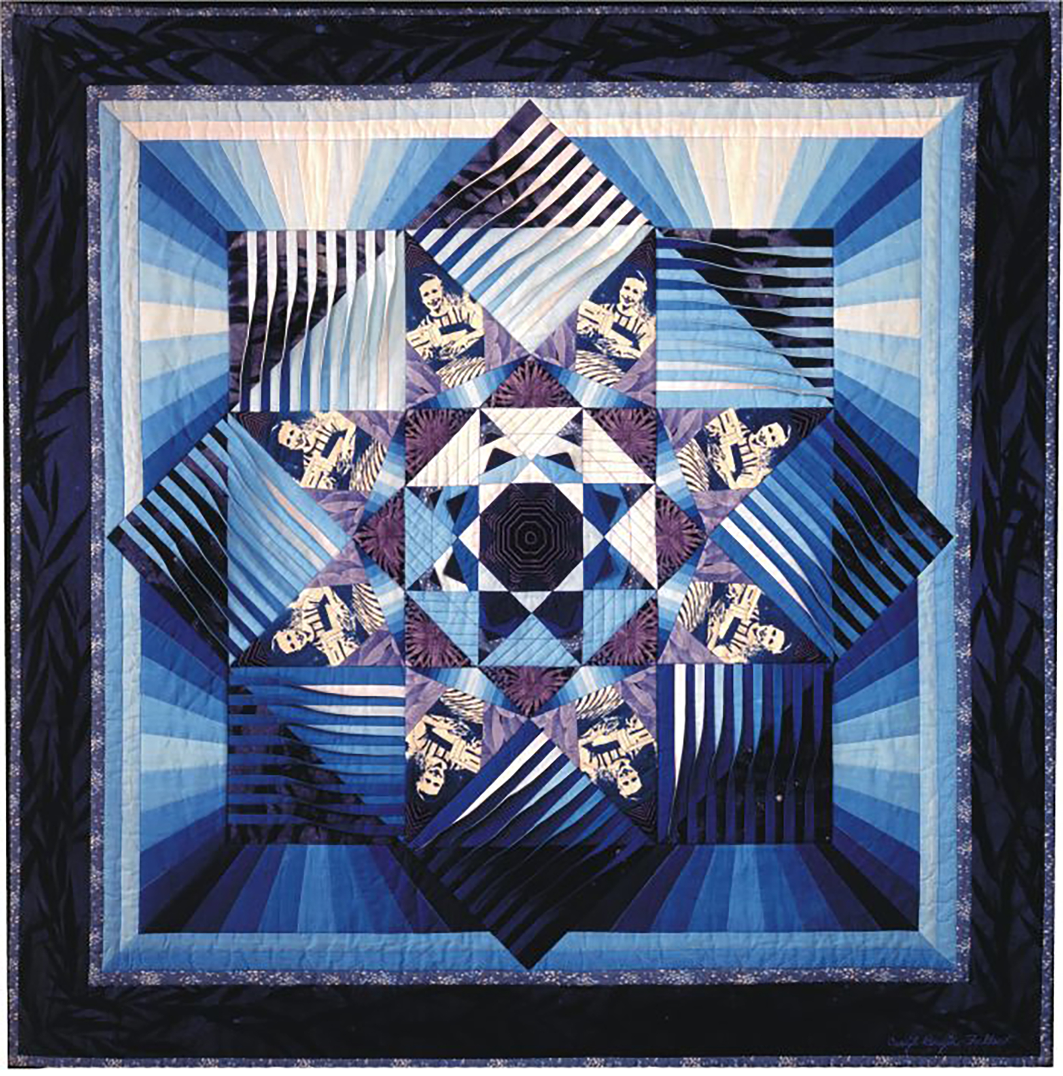 This quilt was originally designed for a show called "A PALETTE OF PRISMS" in Cazenovia, NY. The design limitation set by the show was to work in 12 shades of one color. The color I chose for my hand dyed fabric was blue #404 from Pro Chemical and Dye Co. A silk-screen was made from a photograph of me sitting at my sewing machine, working on one of my three- dimensional "tuck" quilts. The dark blue "weed cloth" fabric began as dark blue hand dyed fabric. The dark blue fabric was laid on the floor of my garage, and willow leaves from a tree in my front yard were laid on top of it. A fine mist of chlorine bleach was sprayed over the fabric from several feet above the garage floor. As the chlorine bleach settled on the fabric between the willow leaves, the dark blue dye discharged almost immediately, leaving the shadow of the leaves. The fabric was dried, and washed repeatedly to remove the chlorine bleach. In this quilt I experimented with combining modules of three-dimensional tucks and two dimensional patchwork. The overall design is based on a traditional eight pointed star. By enlarging the star, and then further dividing the spaces with the star, the design became a complex medallion.
