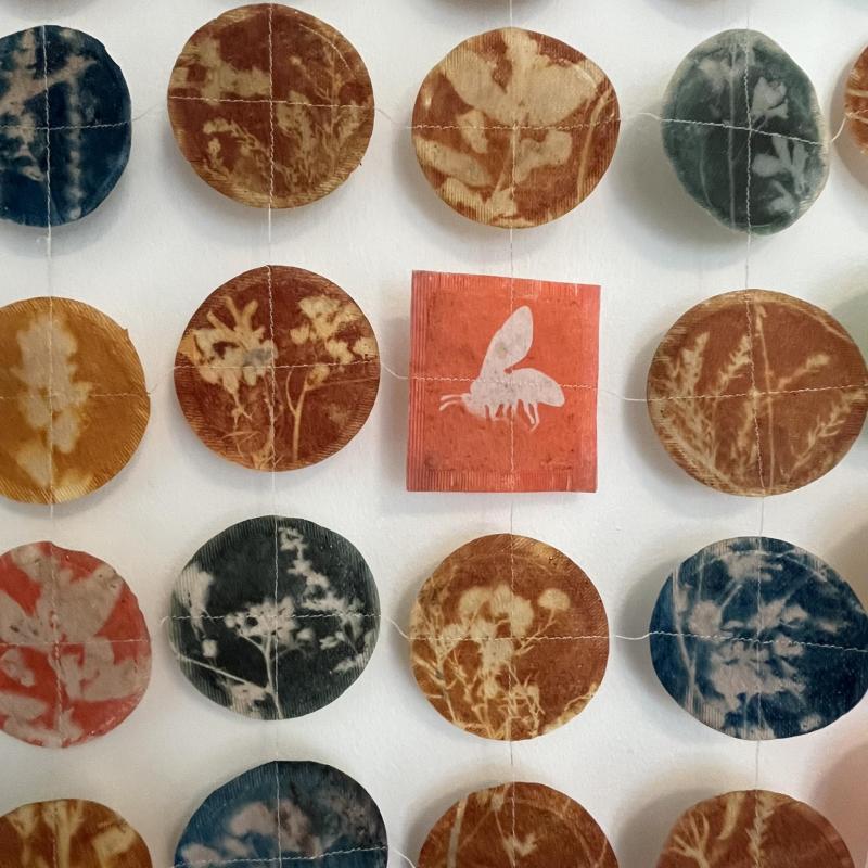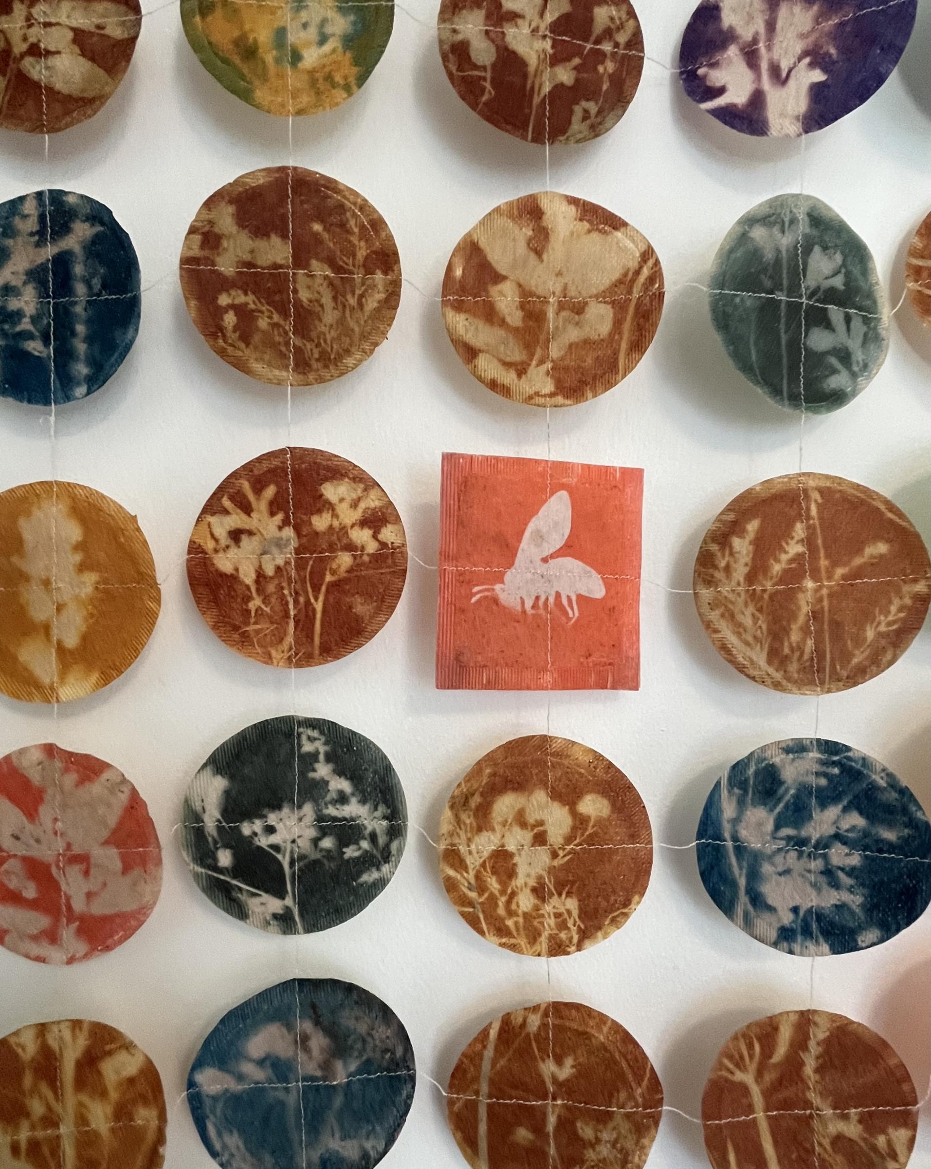 Used tea bags, cyanotype chemicals, Solarfast dye, polyester thread, coffee filter sleeve, wooden dowel