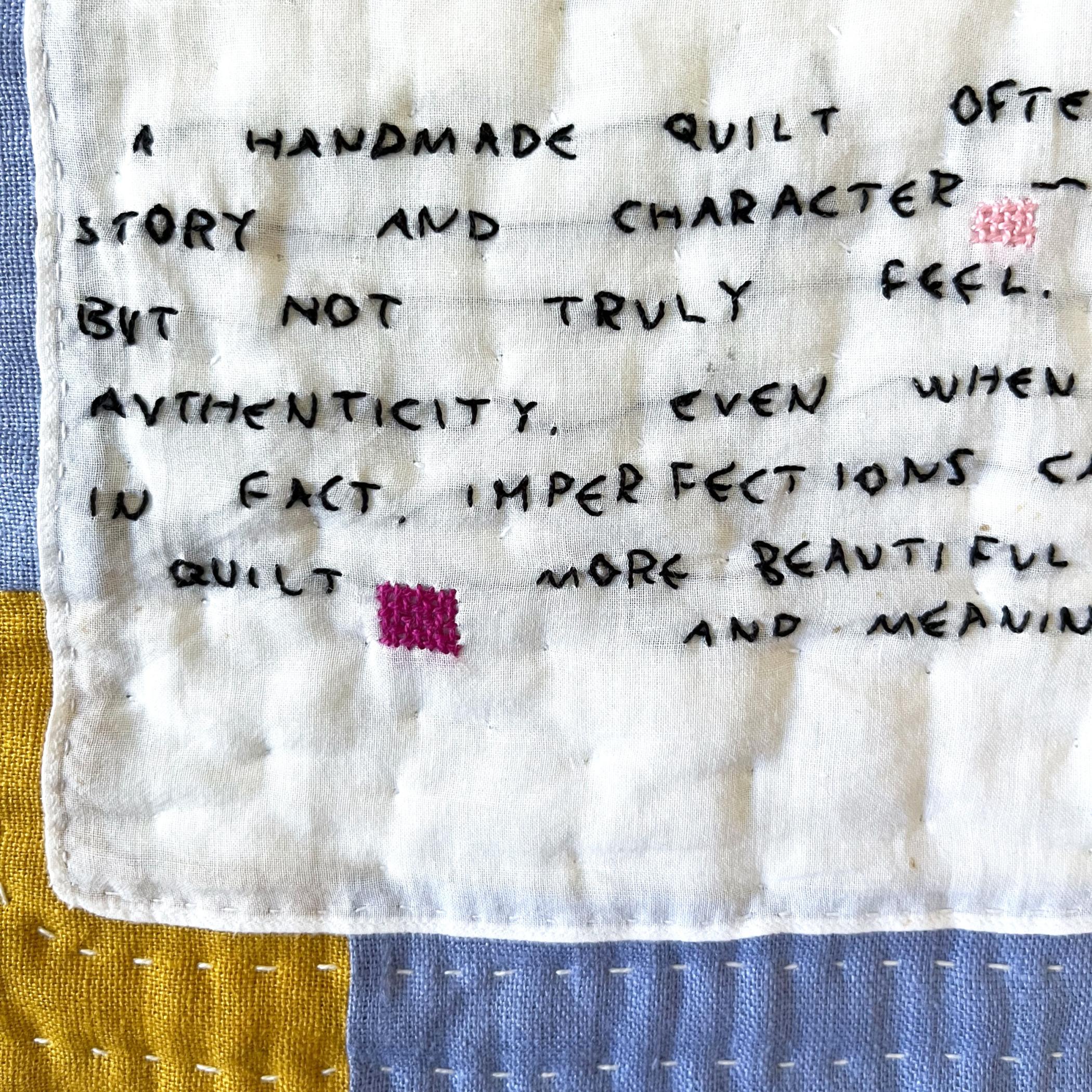 There is a beauty in seeing the maker’s hand and noticing the skill, emotion, and character through an artist’s stitches. Growing dependence on AI not only has far-reaching environmental implications, it also takes away the beauty that lies in the individual stories and imperfections of the maker. As you can see from this AI-generated response to the question, “Can an AI quilt look better than mine?” even AI agrees that a handmade quilt can be more beautiful and meaningful.
