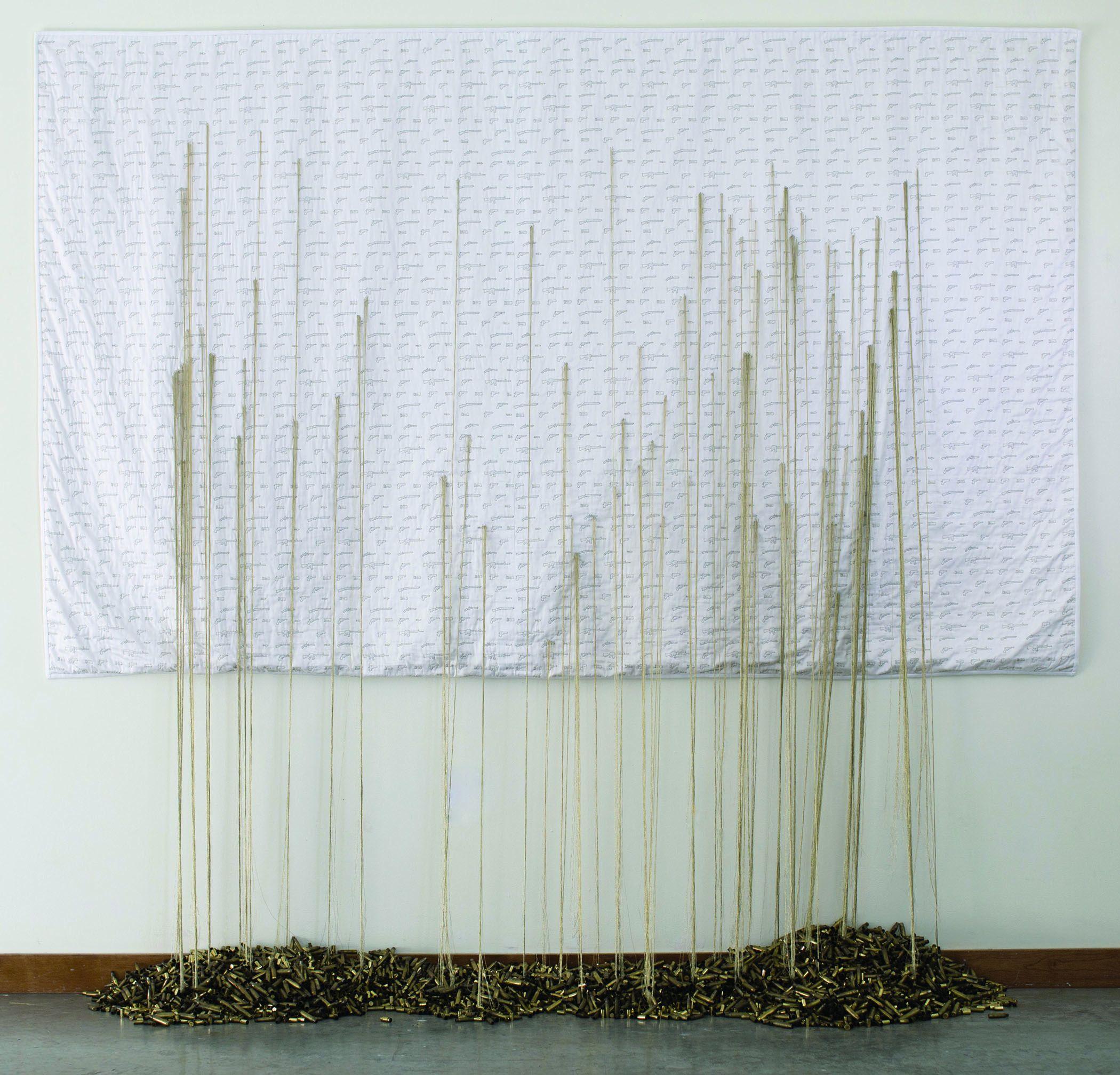 The custom fabric design and whole cloth hand stitching technique connect to the types of quilts that were created when the Second Amendment was written. Sharp contrast is given between the types of guns that were used during the late 1700s and the guns used in today's mass shootings. The lives that are lost don't seem to change our broken government's "leaders". Common sense can only tell us that laws need to change, now. Each thread anchored into the brass casings signifies the number of mass shootings in an American city.