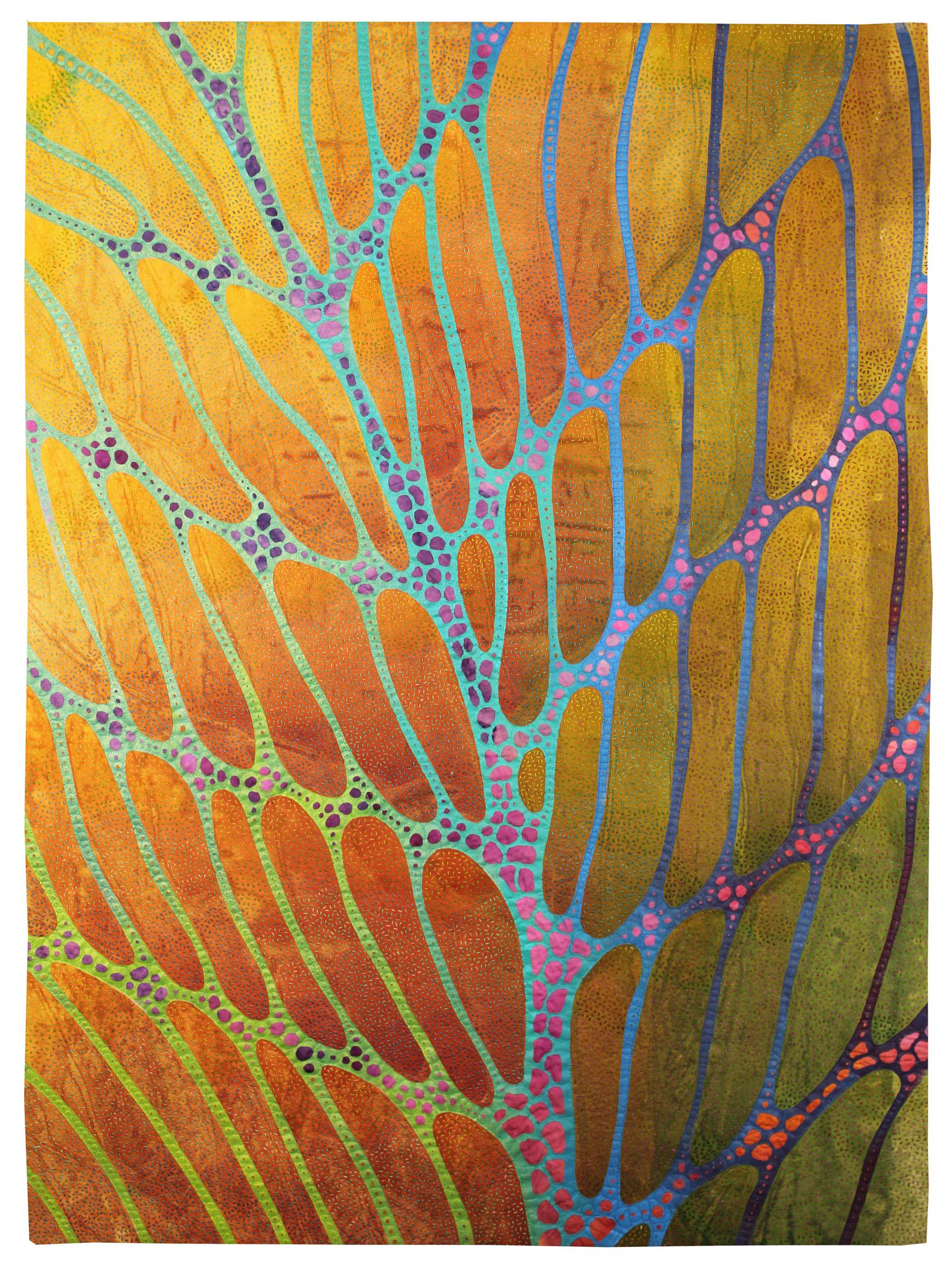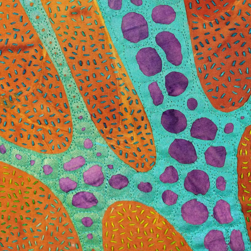 Fused machine appliqué, machine stitched, hand stitched, painted, dyed