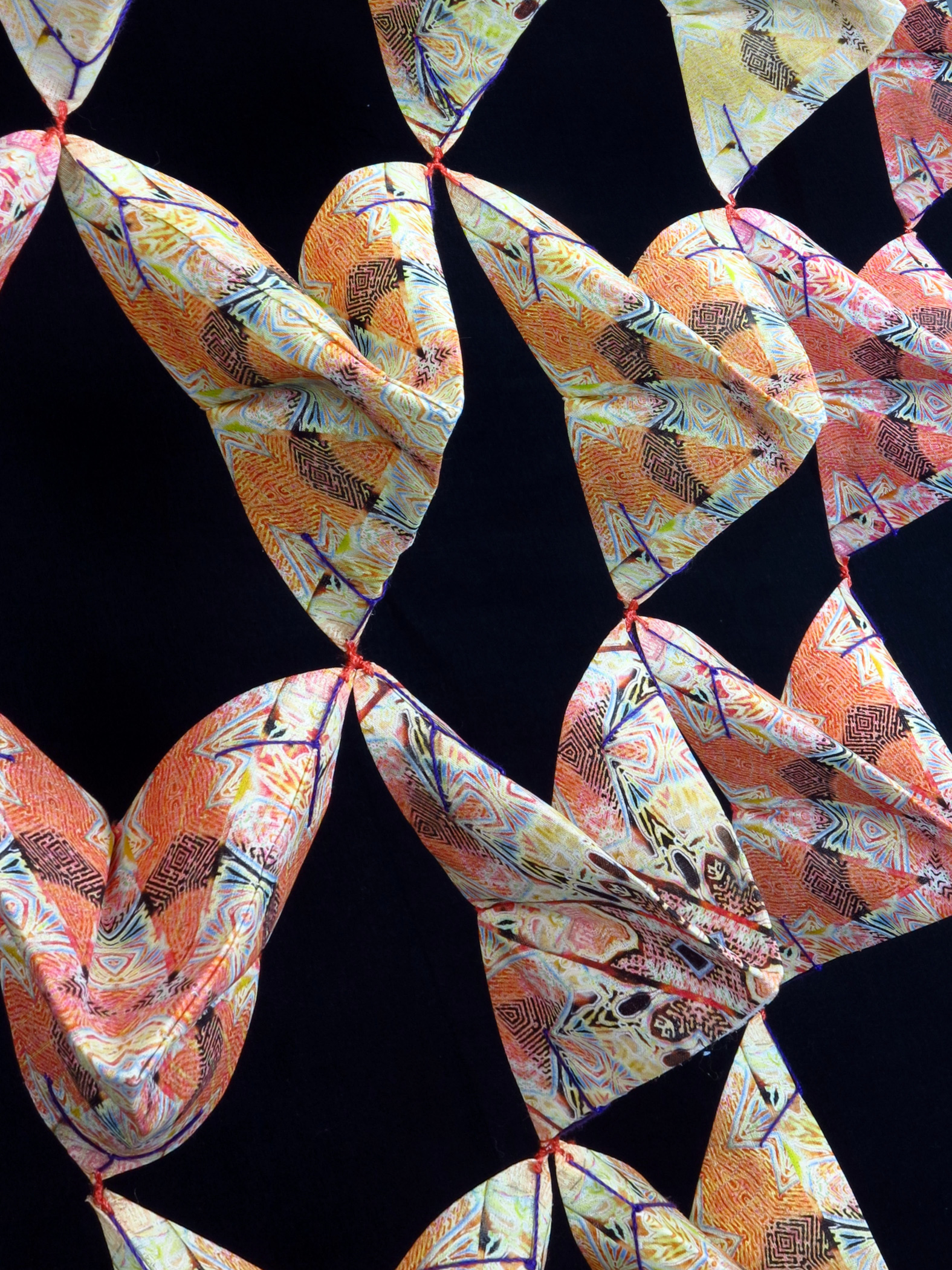 This dual-sided piece explores the intriguing notion of metamorphosing the digital elements of one of my art quilts to create another; a kind of digital recycling. With image editing software, I manipulated a photograph of one of my earlier three-dimensional quilts, thus creating new visual layers to print onto fabric. Traditional hand-folding origami techniques allowed further transformations to emerge, producing three-dimensional forms with folds and stitch. My goal is to explore the creation of volumes, stitched in interesting new configurations, so that the DNA of the original piece is still present, but in a permanently altered visual state.