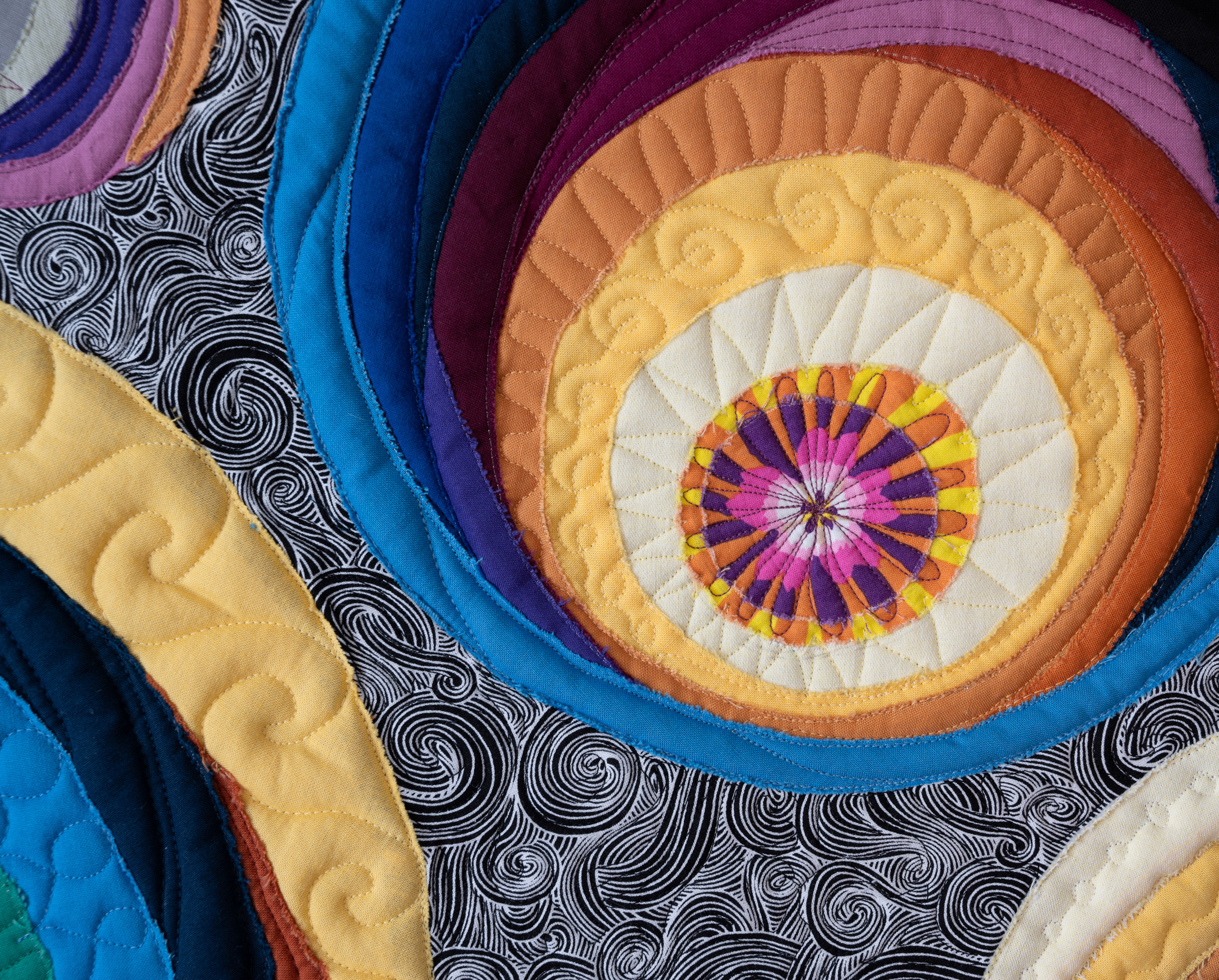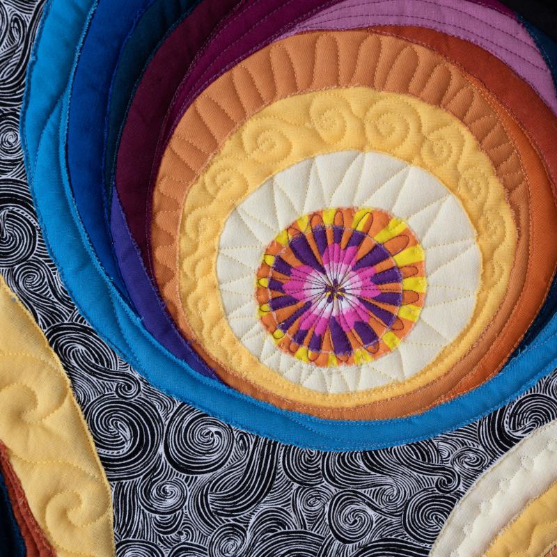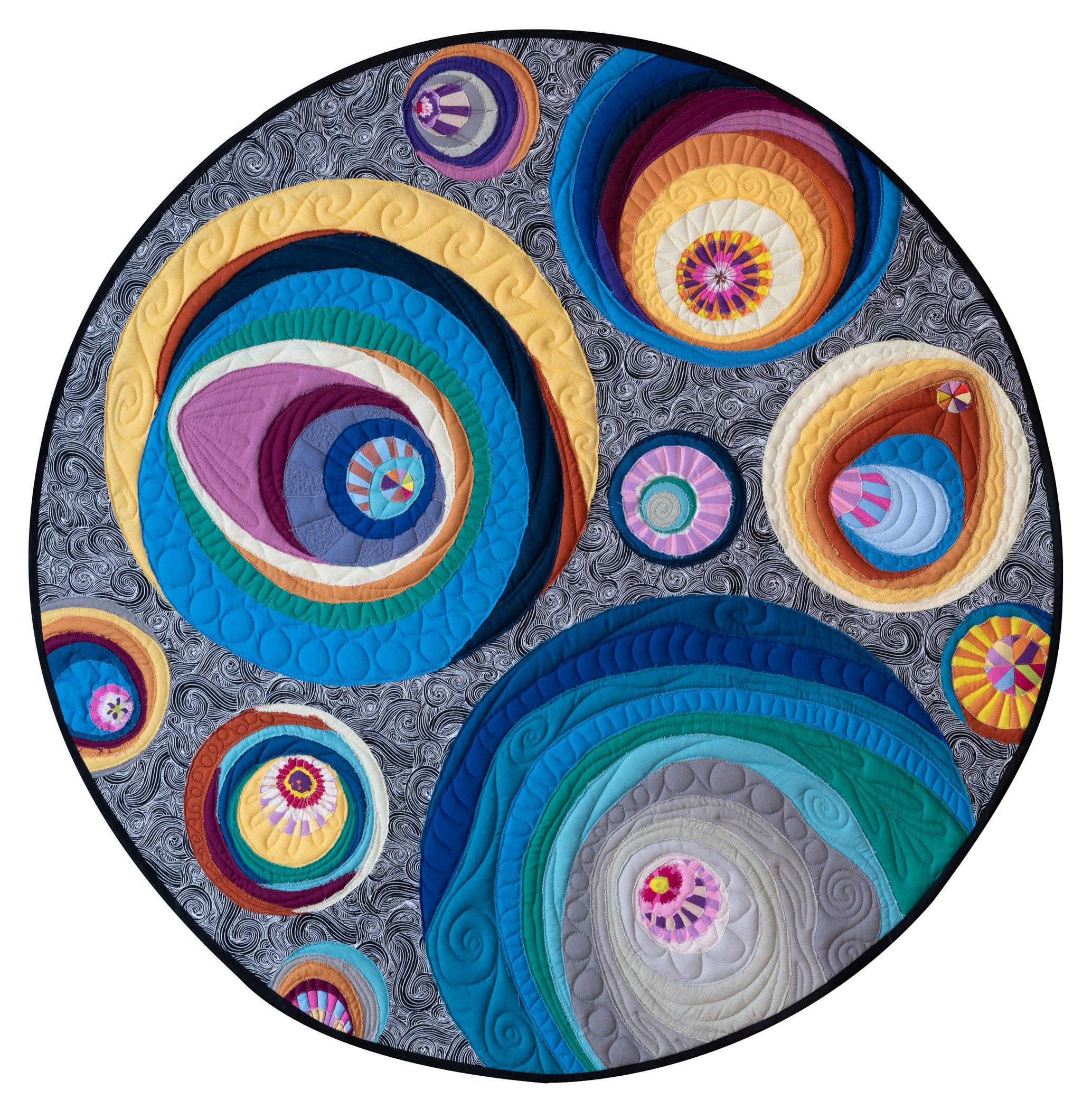 Looking through the ocular of a microscope onto a film of liquid soap submerges you in a universe of bright colors. Circular shapes are highlighted by a print in the center. The quilting makes them even more unique and gives a 3D-effect which would not be possible under a microscope. The black and white fabric underlines