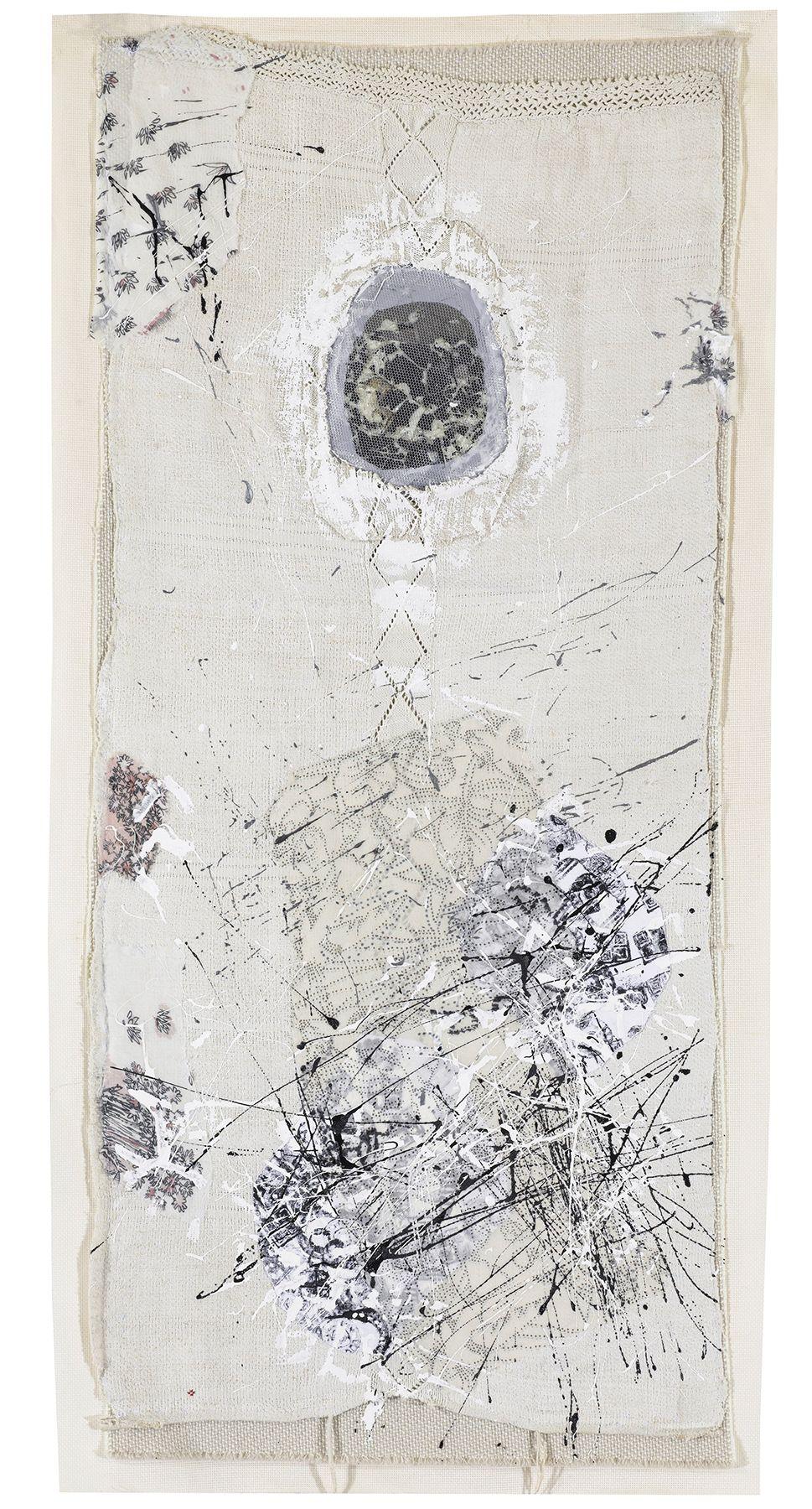 I enjoy the idea of recycling and reusing materials to give them a new lease on life. I found the broken mirror fascinating, and take great pleasure in hunting for different textiles which I then layer, mixing opaque and transparent to create a three-dimensional effect. I work with a variety of mixed media, drawing on the textiles with pencils, pastels, oil sticks, and acrylic.