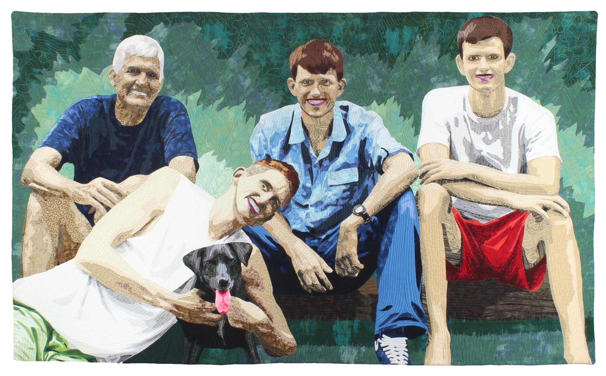 A dear friend of mine commissioned this piece of him with his three sons and family dog. I knew it was a highly complex piece that would push my skills, but I created it in sections, mindful of how the fabrics needed to work in harmony between each person. When it was done, he gave it to his wife, and as she marveled at her family recreated in cloth, I felt such joy to have given them something they could never have expected.