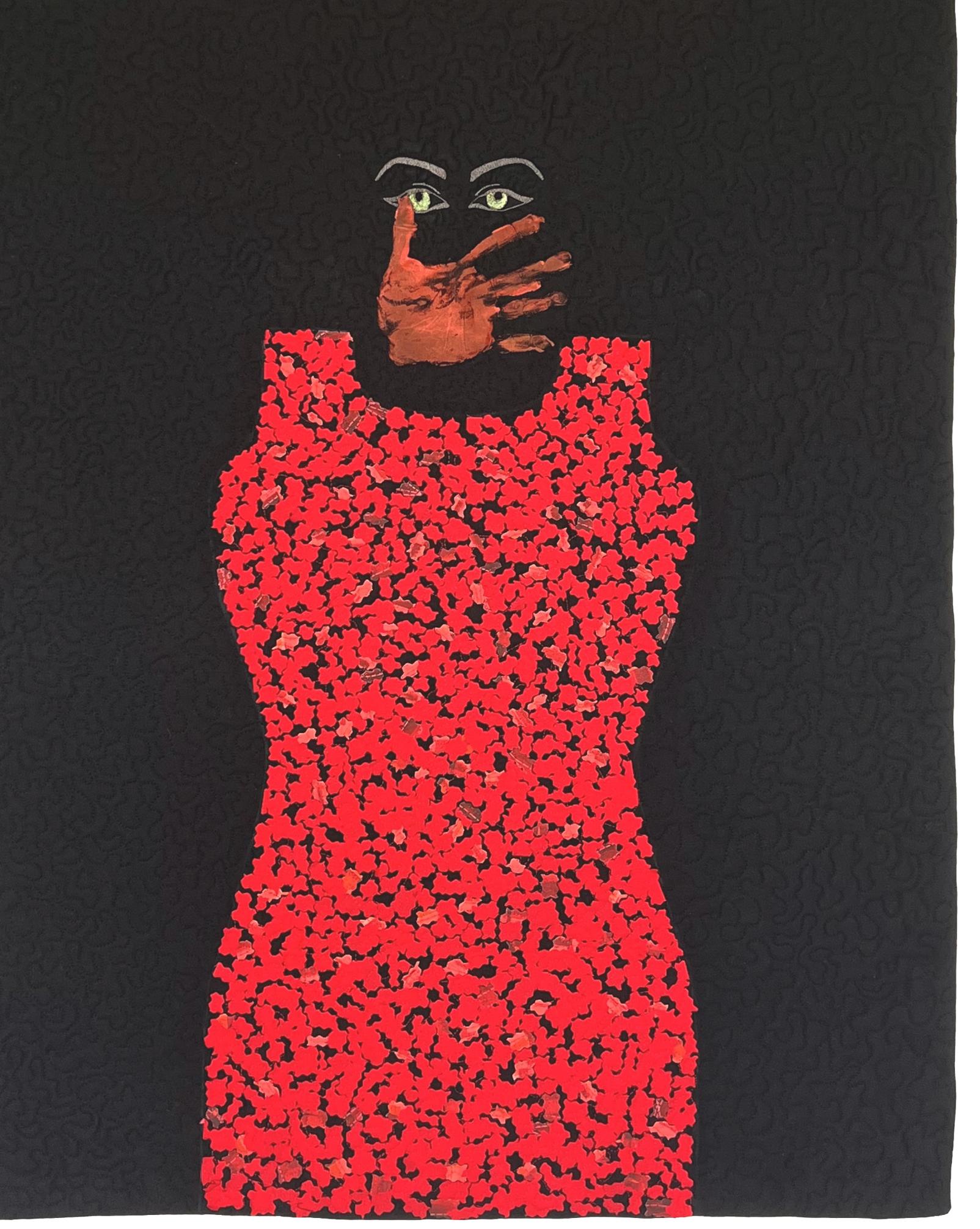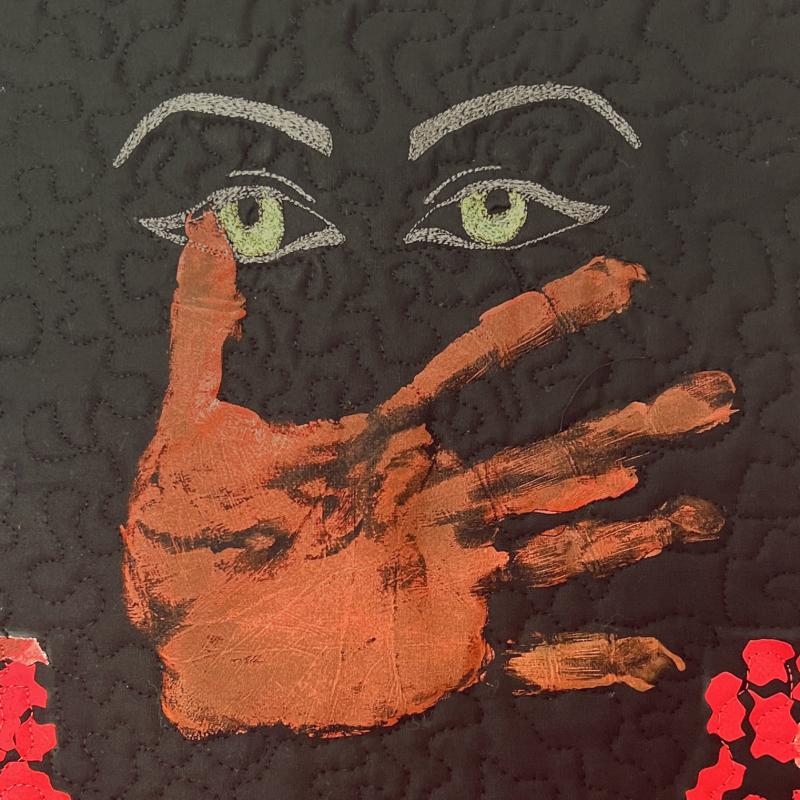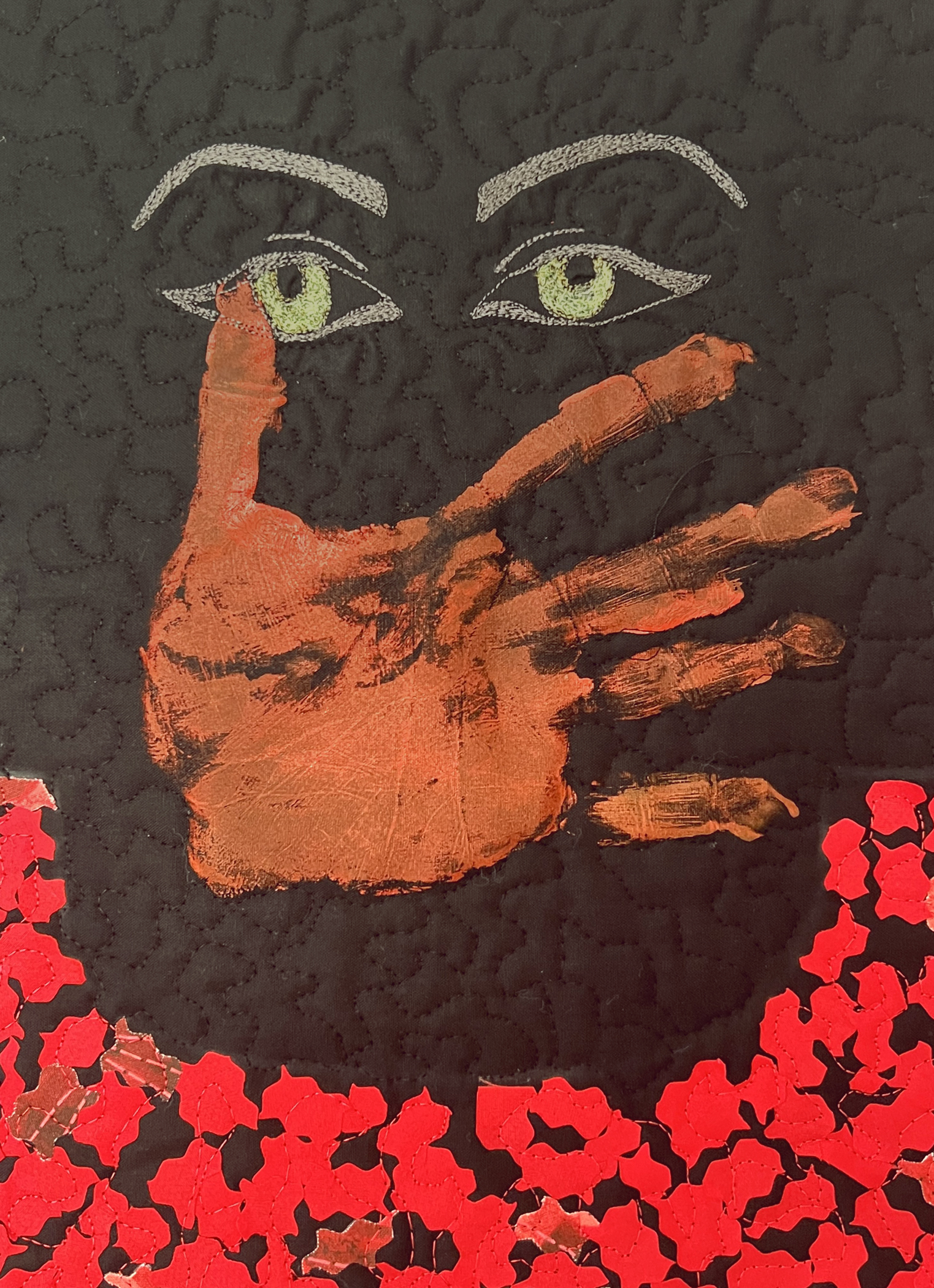 I recently learned about the Missing and Murdered Indigenous Women (MMIW) movement. Though rarely reported, murder is the third leading cause of death for Native women. This number is startling because Native people only make up 2% of the U.S. overall population. A red hand over the mouth has become the symbol of the MMIW movement. It represents all the missing sisters whose voices are not heard, and the silence amid this crisis. February 14 is MMIW National Day of Action and Awareness. May 5 is the official MMIW Day, Wear Red Day, and is also known for “No More Stolen Sisters.” My hope is that this traveling art quilt will bring awareness to MMIW. Go to Nativehope.org for information.
