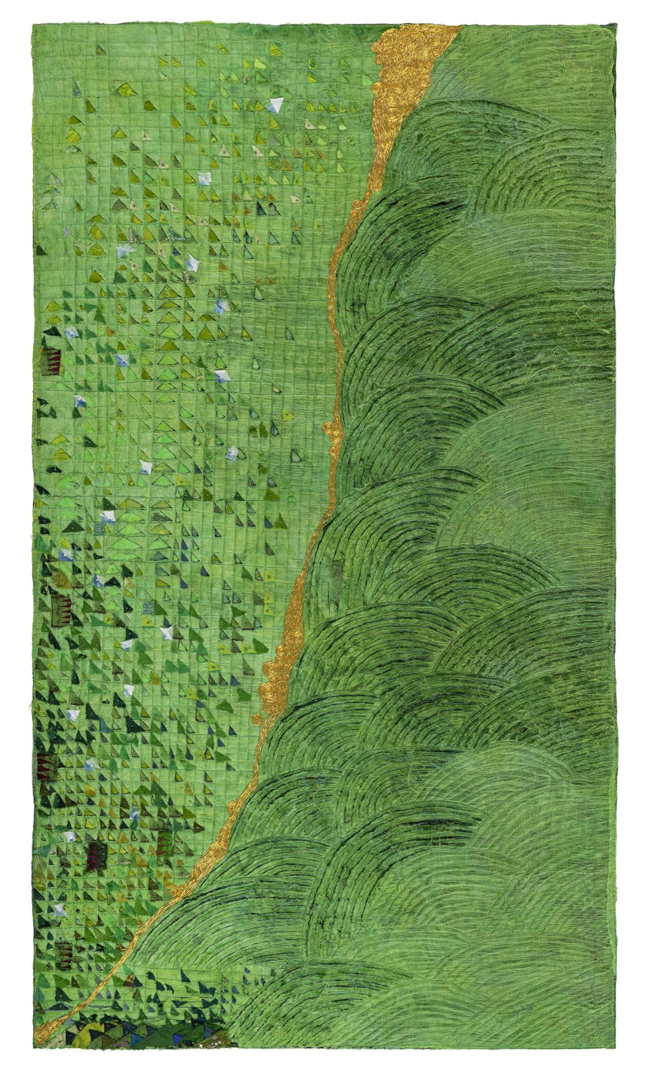 This piece was inspired by the Japanese concept of Kintsugi, traditionally a method of repairing broken pottery with gold. It is a way of honoring the break and becoming stronger with the repair. The tow sides of this piece are joined by a river of gold joining the more structured grid with the soft flowing lines of the other side.