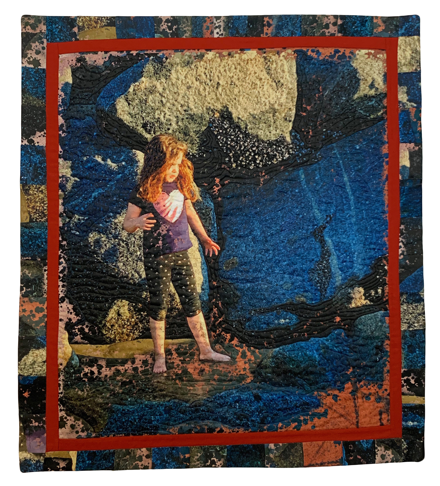 I digitally manipulated my iPhone photo with an iPad app dramatizing the rocks and water. Seed stitches all over the surface add texture to the flat surface. Machine pieced border.