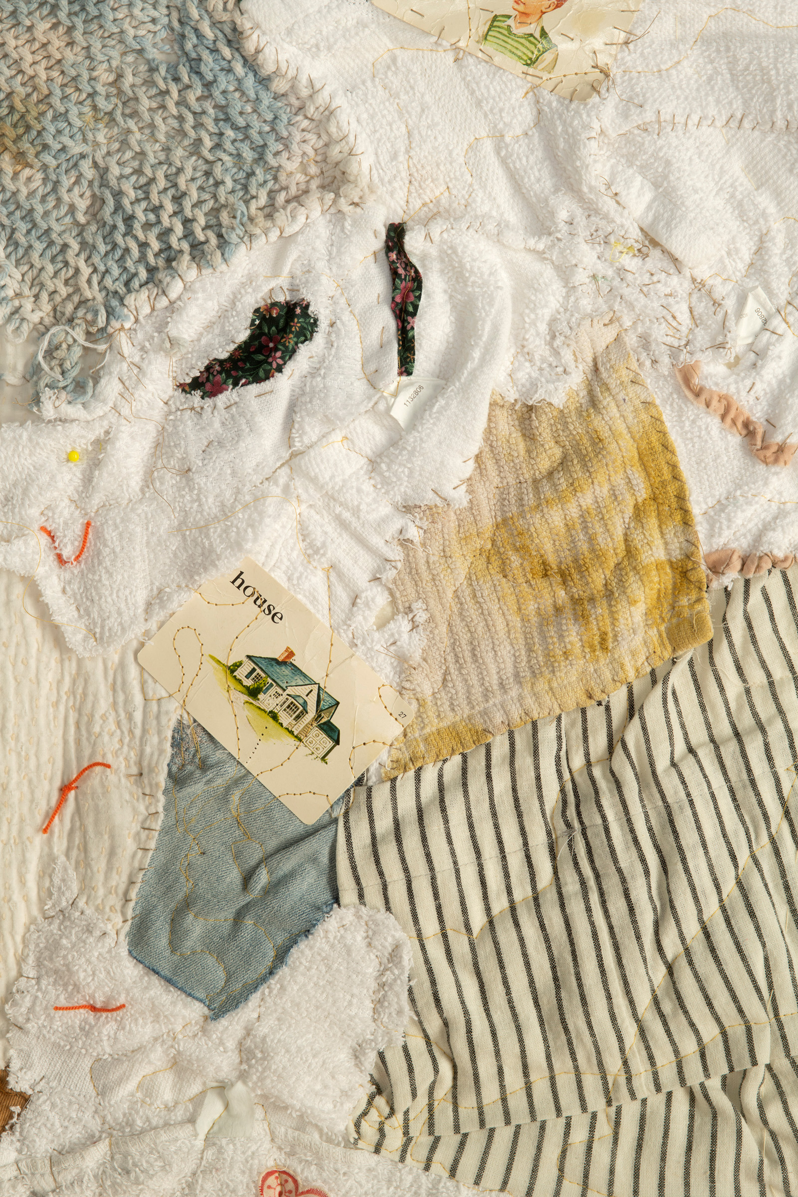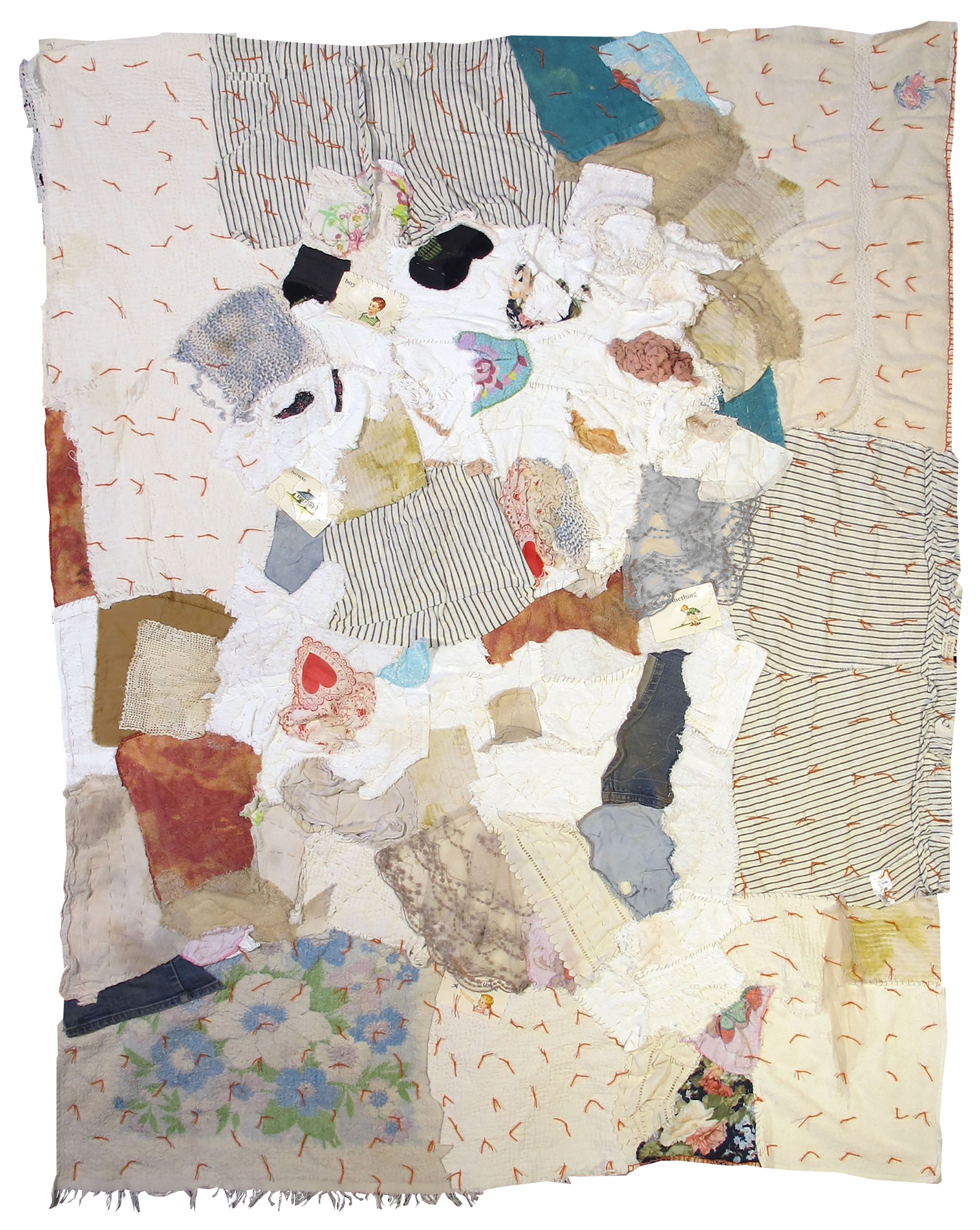 My mother, who once was an amazing seamstress, has lost her skills to vascular dementia. However, something lingers from her days of maneuvering fabric. She obsessively cuts at household fabrics—mostly washcloths and her own pants. I made this quilt in an effort to find meaning in her “new work.”