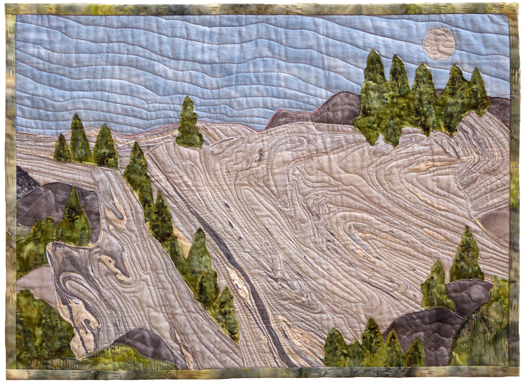 Moon Hike uses the directional lines of the fabric to make the composition, creating a Sierra Nevada mountains moment. This was featured in the Ventura County Museum of Art first art quilt exhibit in 2009. I have made almost 200 art quilts; at least 40% deal with landscape or nature images, including using hornets nests for their color and texture. I also like opposite challenges such as bridges, food, and mannequins. As artists we take it all in; then we have to comment on it with our work. My studio is 14 by 14, and in the summers I work in a cabin. I am a three year cancer survivor. My art keeps me going.