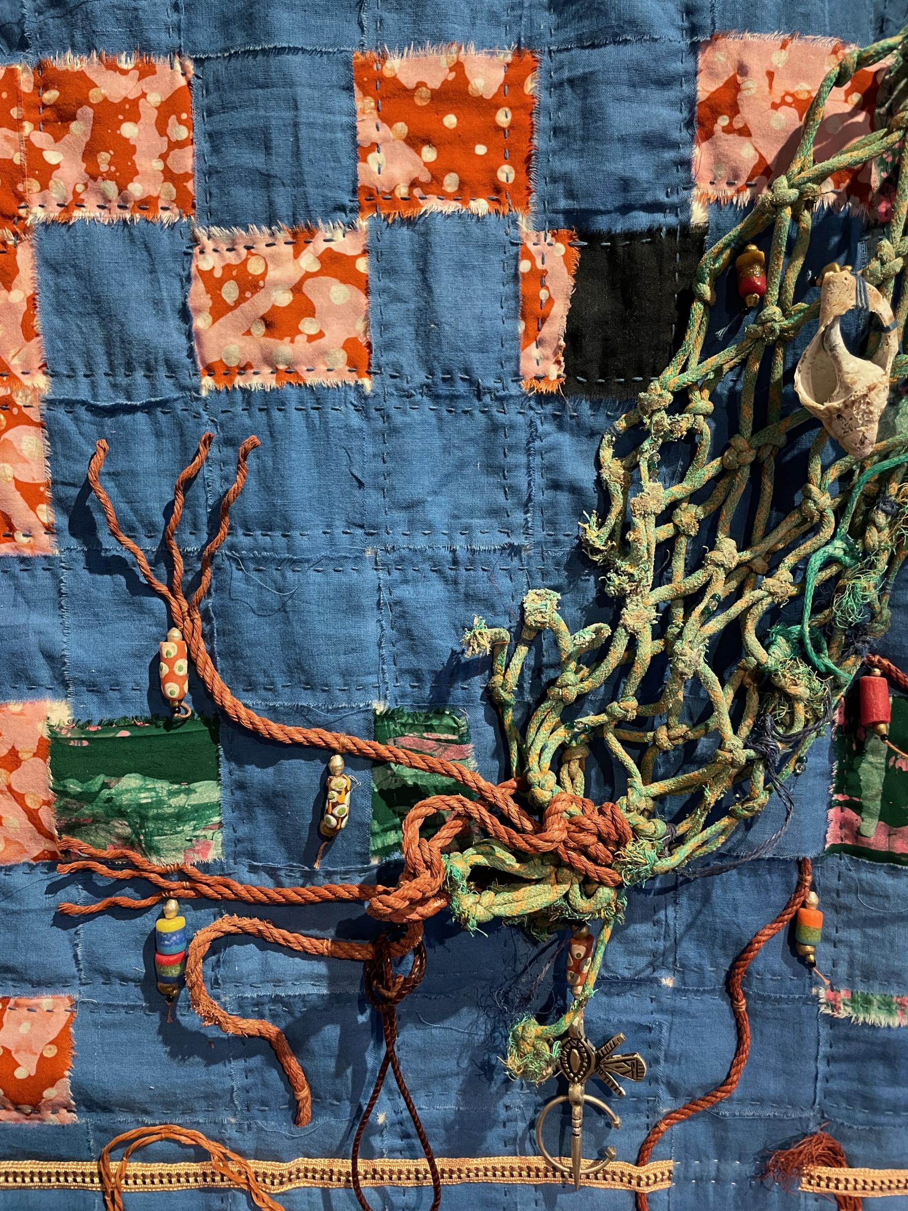 On a camel in the Sahara Desert, my indigo blue headscarf shielded my face & matched the sky. To the west is the ocean, pieces of brilliant fishing nets scattered on beaches. The land & people are referenced in this textile collage, capturing memories & stories for a viewer to decipher & experience.