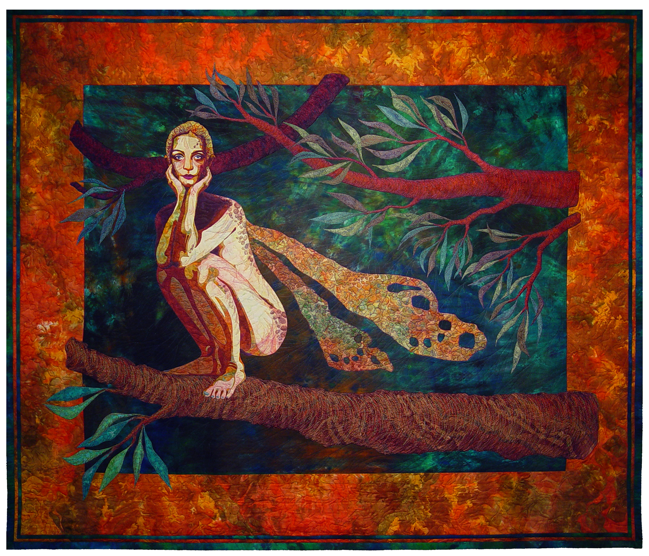 In previous quilts I had used either all cottons, or all tulle to create my figures. The Moth Fairy will stand out as a bridge quilt, combining the reverse appliqu� technique using cottons, which give me the most control over placement, and the wash of shadow effect that is possible with tulle. The tulle was layered on, one spot or stripe at a time, and then enclosed under one final layer of blotchy hand-painted tulle.