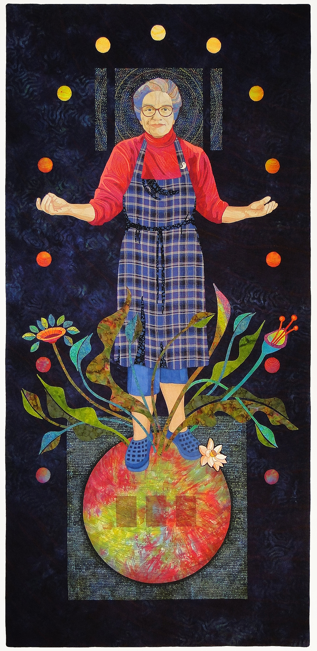 Reverse machine applique was used to create all of the complicated imagery, with small amounts of Copic Markers to round out the large and tiny planets.