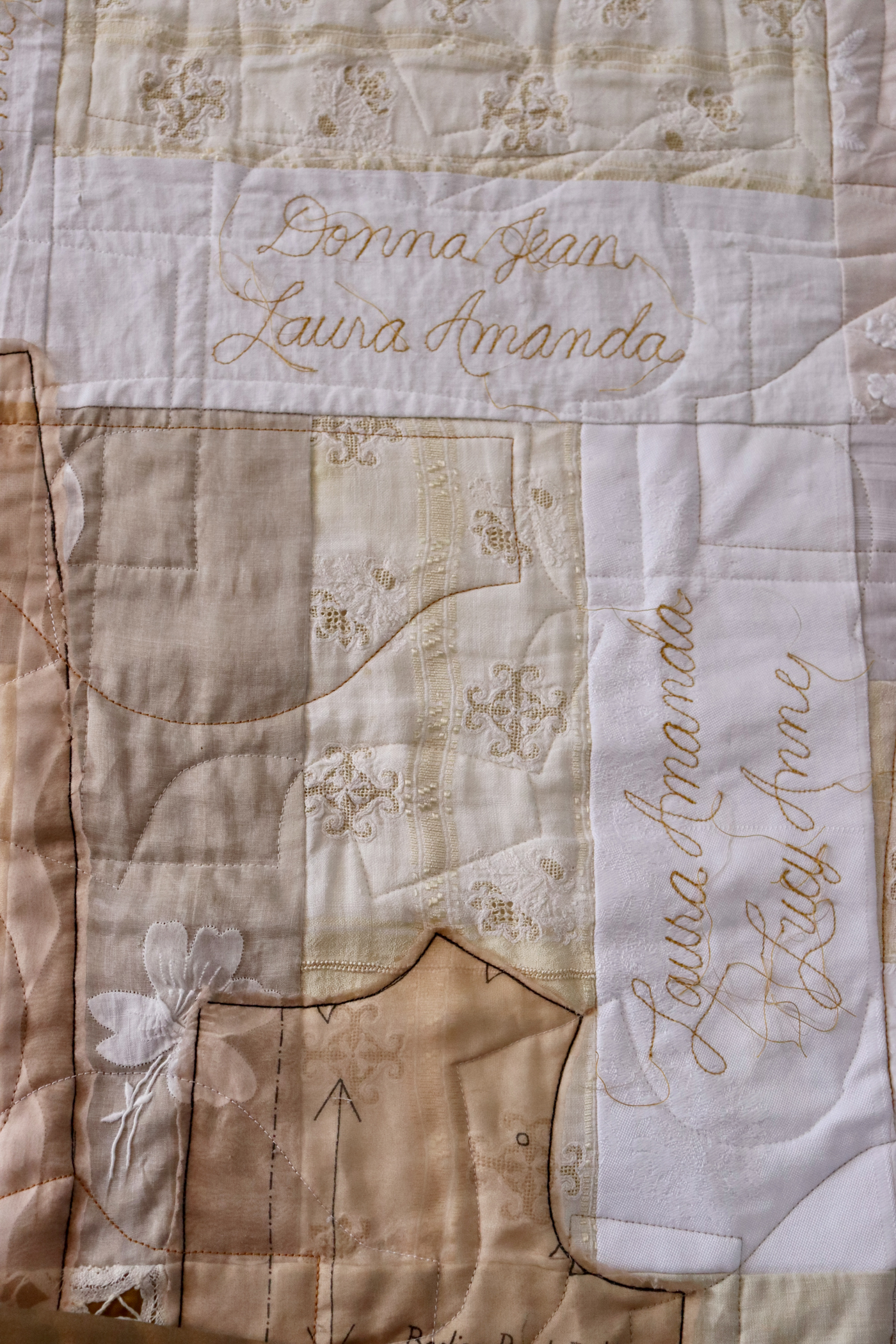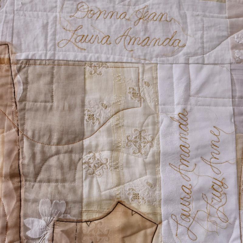 My quilt uses vintage linens, laces, and trims in a traditional split rail fence block that is overlaid with hand dyed silk organza pattern pieces to represent the tradition of making a baby’s Christening gown from her mothers’ wedding dress. The mother and daughter pairs in my family from my great, great grandmother down to my granddaughter are named in machine handwriting that deliberately leaves the ending threads loose and unburied. It is quilted with white, cream, and gold colored threads.