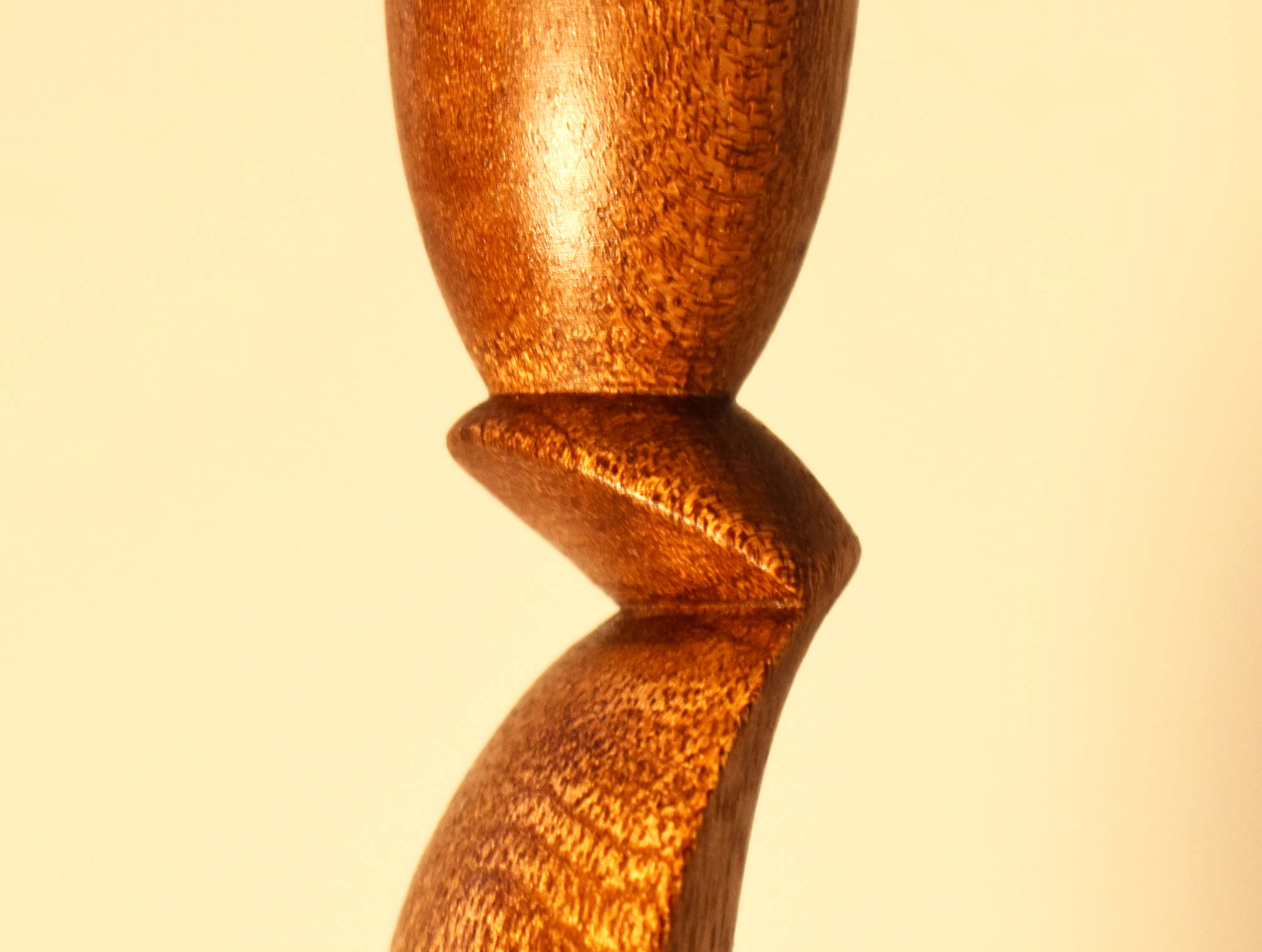 In an attempt to create a piece that confounded woodturning’s typical symmetry, I experimented with multi-axis turning to sculpt a dynamic, asymmetric, curved spindle. Multi-axis turning poses many challenges, however, and turning the candle cup was no exception. Turning the wood along an axis primarily composed of air put great strain on the wood and brought it to the verge of snapping—which occurred on my first attempts. The result is a pair of functional, identical sculptures that invite the viewer to explore them from every angle, engaging both visually and tactilely. The flowing lines contrast the prismatic base and the warm tones of the mahogany.