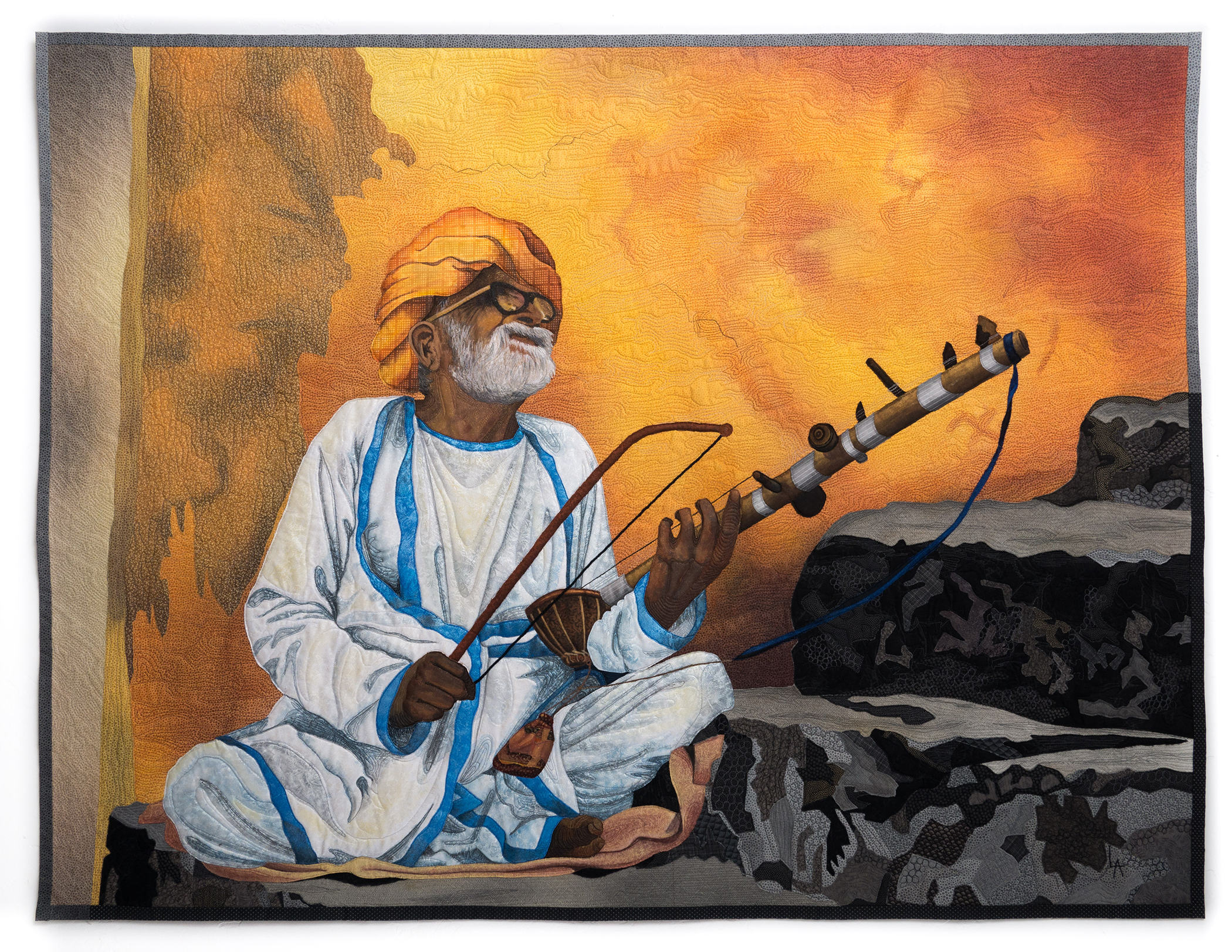 I work 6 days a seek, 6-8 hours a day....it is my passion. I wake up exicited each day to do the next step on whatever my project is. I like to tell a story of people living their life; every one has a story. I love to capture the viewers eye with strong graphic shapes and color, and then upon close inspection, see all the subtleties of fabric texture and rendering, as well as intense stitching.