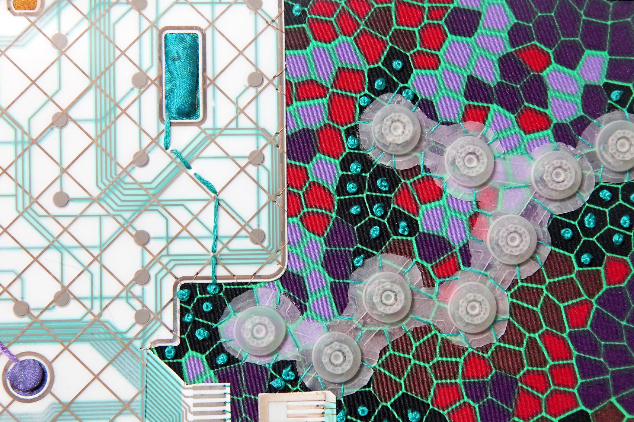 AI is incorporated into the layers of my creative process, from streamlining dye formulations, creating designs, and machine stitching to integrating networks of processes and visual presentations. In this piece, I used printed fabric with microcellular designs to embroider, stitch, and appliqué recycled keypad cushions. They provide comfortable feedback while intricately printed circuits guide my fingertip actions directly into the brain of my computer. AI is learning from me as I learn from it, integrating my actions with the digital universe.