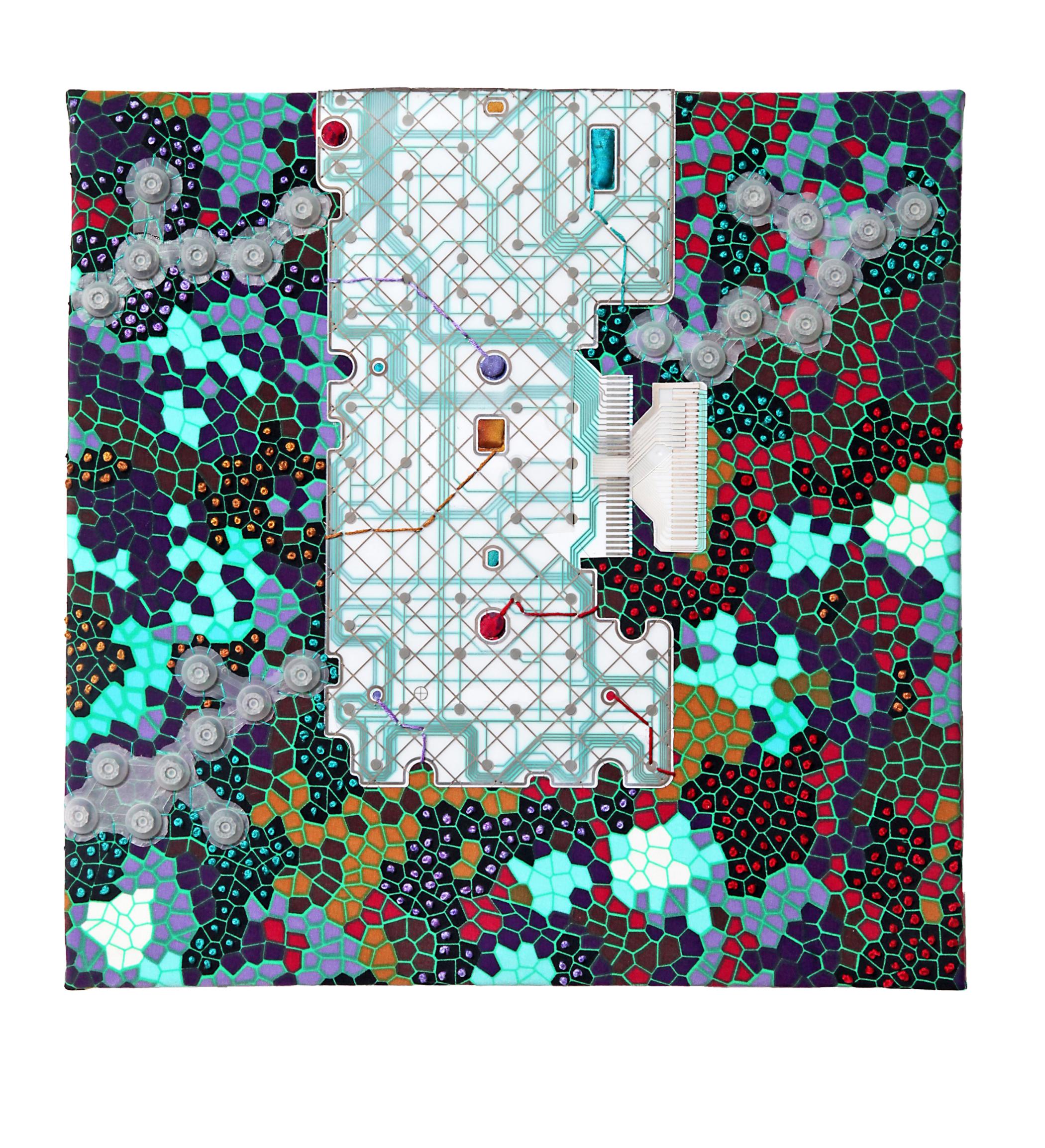 Repurposed digital keyboard parts, silk, cotton, dye, paint, embroidery floss, gallery canvas and frame