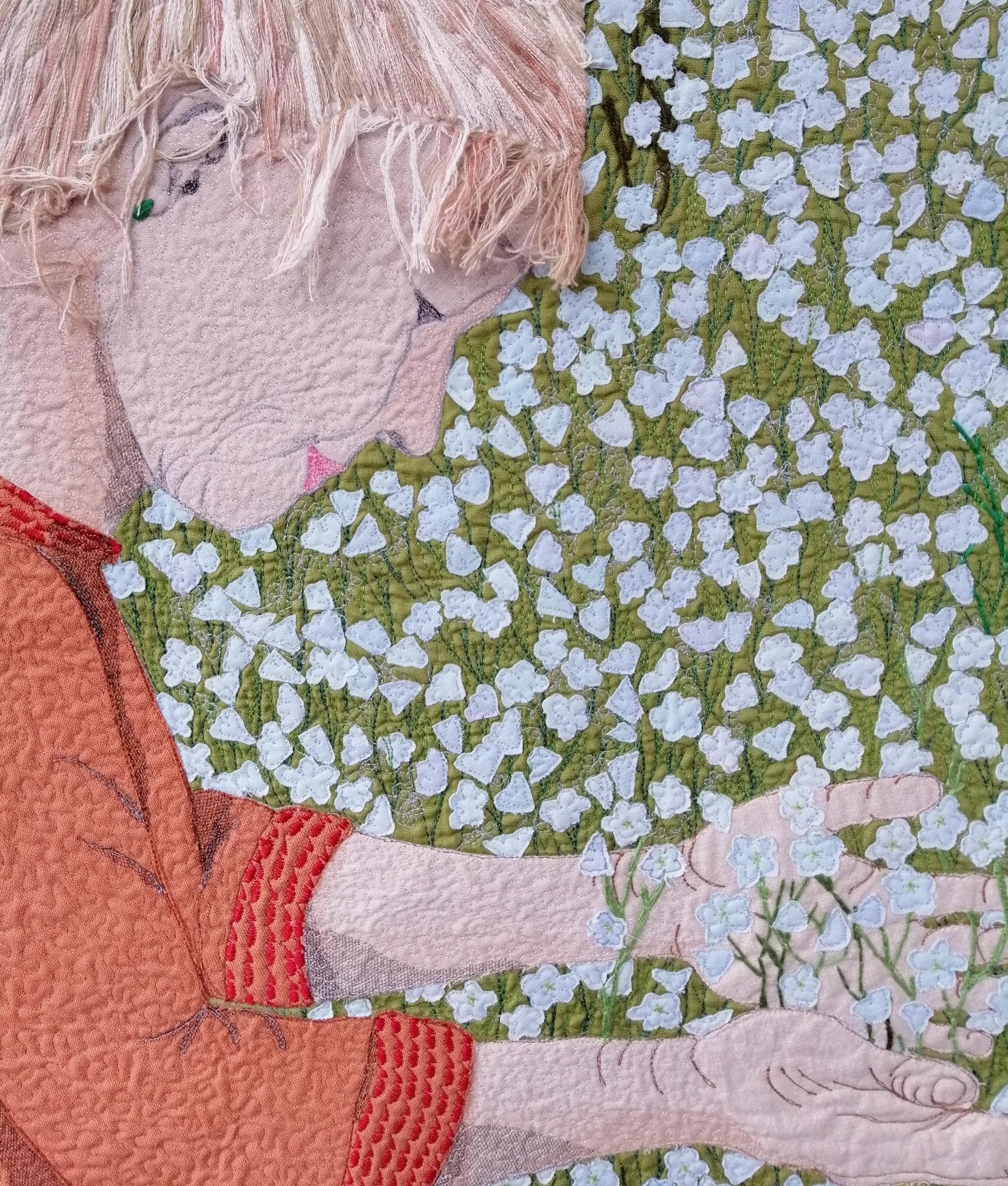 Raw edge application technique. I made my hair out of linen warp. Free motion quilting on a home machine.