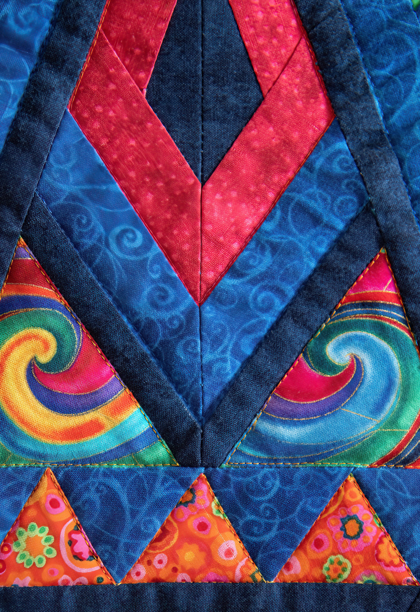 The draft for this particular quilt created a big challenge for me requiring a precise geometric construction. The quilt‘s center consisting of six sections expands outwardly into a twelve part circle. A considerable amount of patience was needed to assemble 1050 individual pieces to create a Mandala until the finished work unfolded it‘s magic.