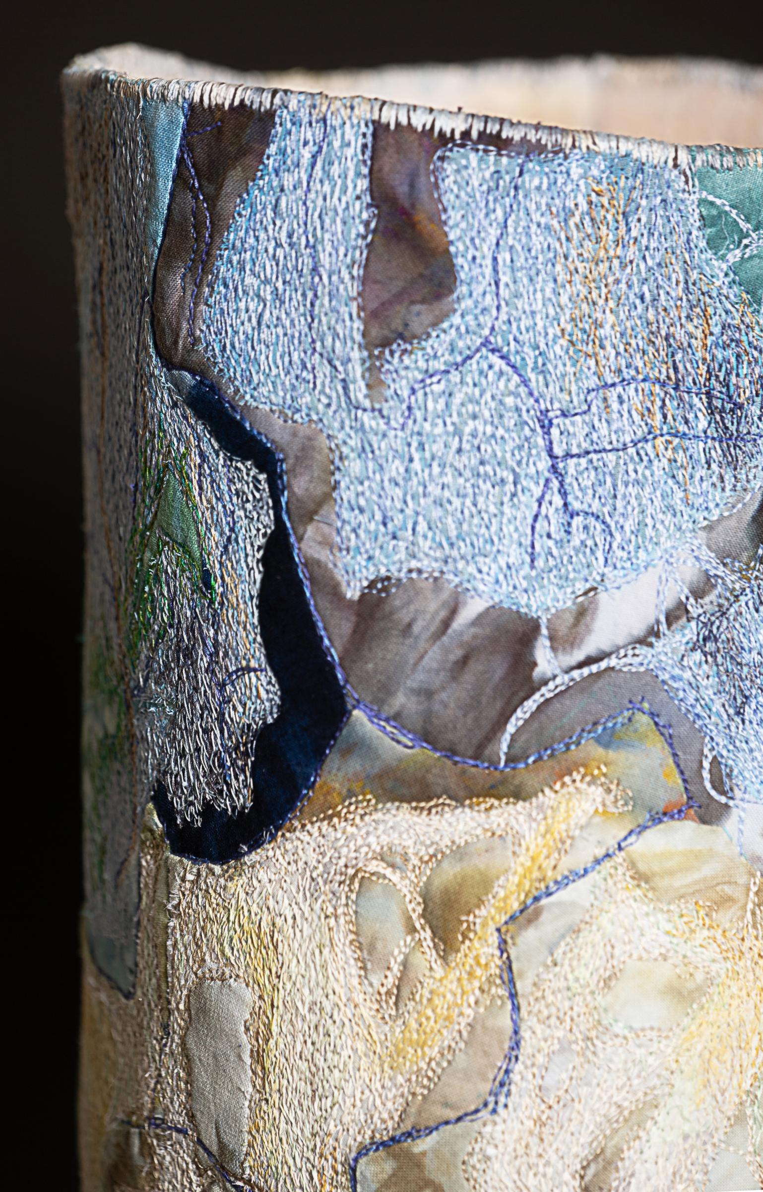 Trees have turned into a source of never-ending fascination and inspiration. Besides their wonderful textures and diverse colors, I'm drawn to their amazing lines and shapes. My series of vessels explores the textures, colors, and lines in the bark of trees from around the world. Multiple layers are used to create my vessels, either by machine or hand stitching, or a combination of both. I'm forced to slow down, to take my time and truly study what nature has so masterfully created as I attempt to emulate its beauty and forms in stitch. My interpretation of this blue myrrh is just one of 170 species of myrrh trees that are known for their papery, richly colored bark.