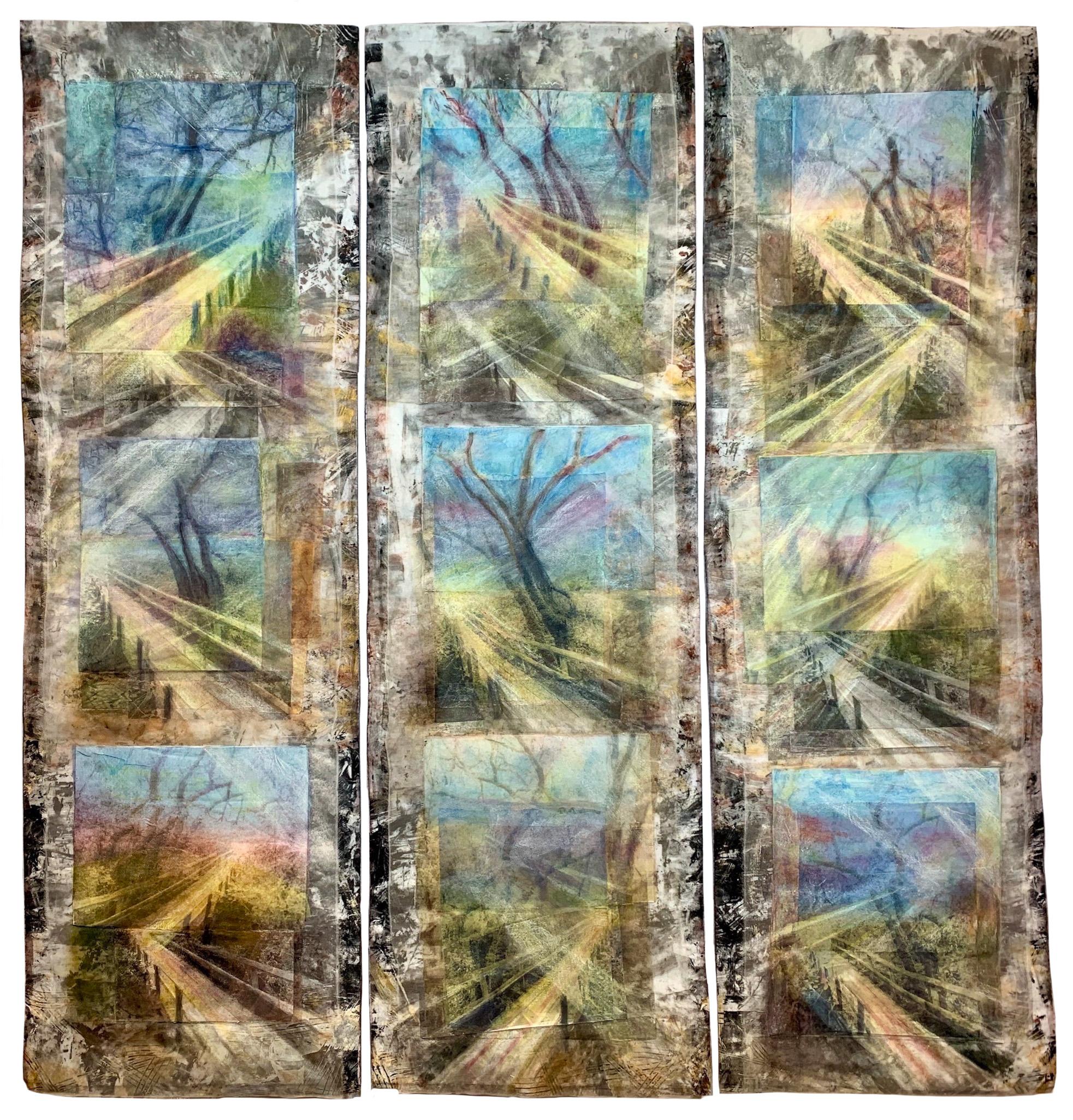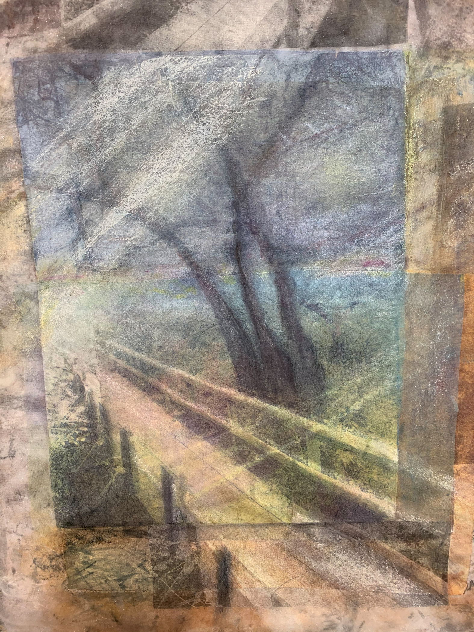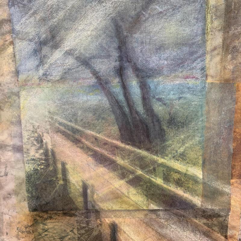 I use the bridge to symbolize crossing into other worlds and exploring territories in ourselves, others, and our opponents. Repeating the image develops different perspectives providing new vantage points to find our way. This work stemmed out of caring for my mother, learning to meet her wherever she was, in the process with Alzheimer’s Disease.