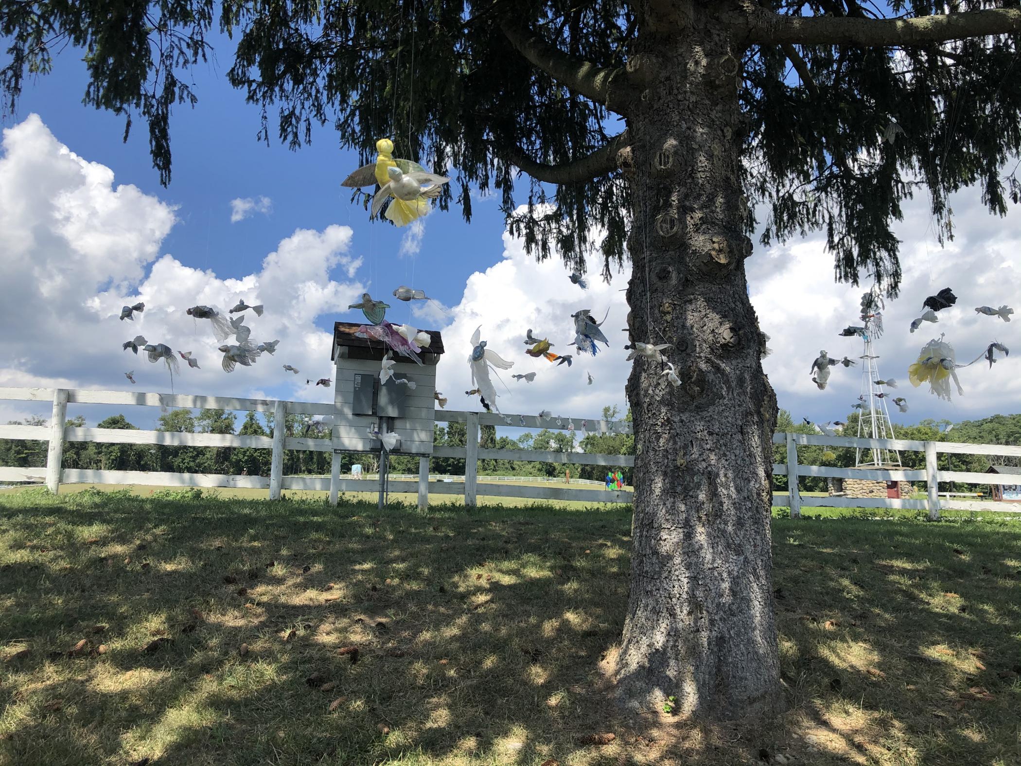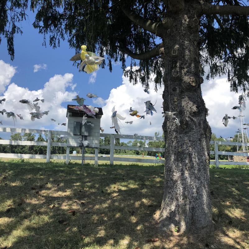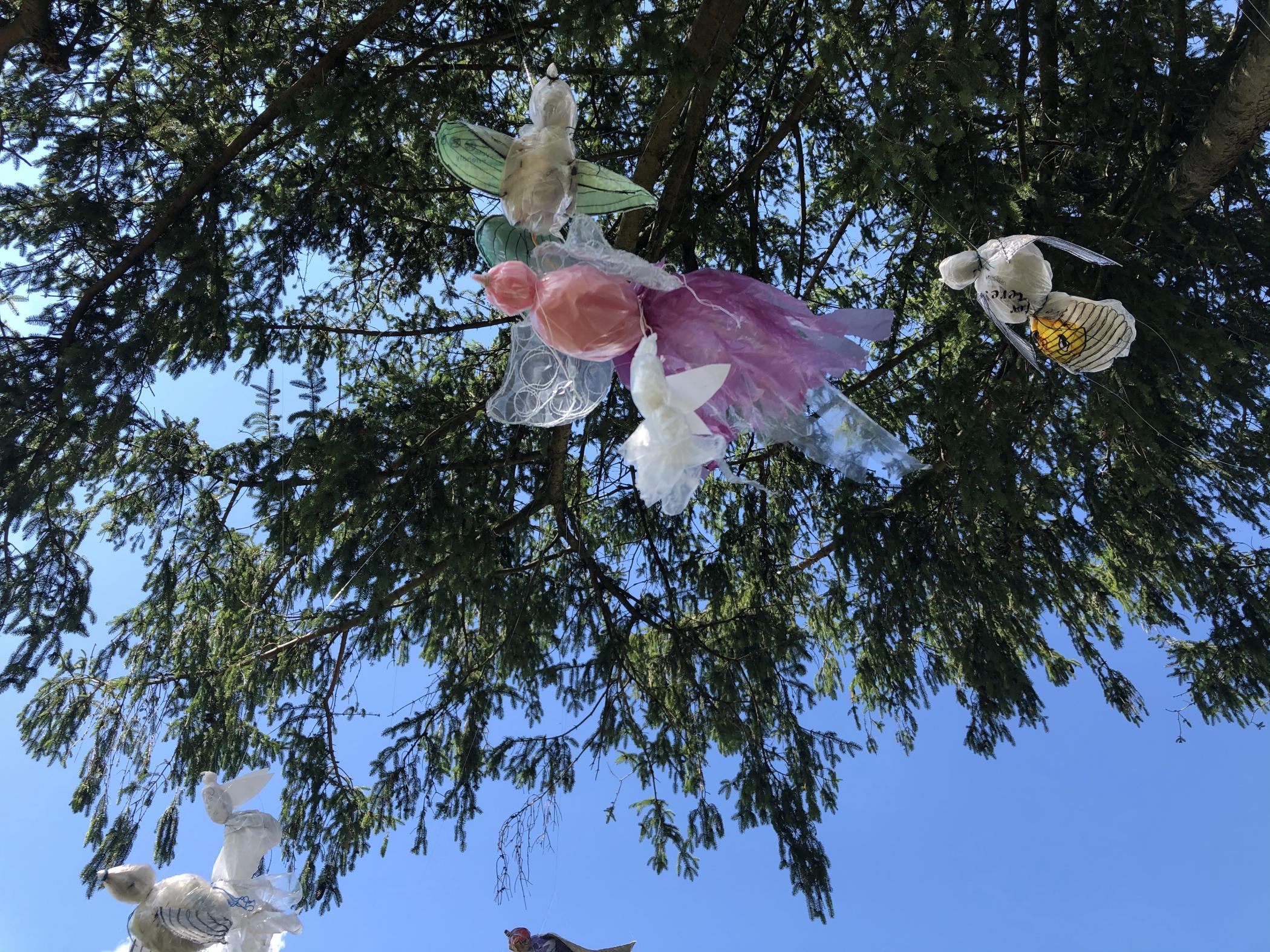 “Speaking of Birds” is an outdoor installation of birds stitched and formed from single-use plastic. Viewers will note the irony in crafting birds from a material that is polluting our environment, and contributing to the deaths of thousands of birds as they become entangled in plastic bits or mistake it for food. The whimsical appearance of the birds belies the importance of the message, echoing the contradictions people encounter when weighing convenience with recycling and proper waste disposal.