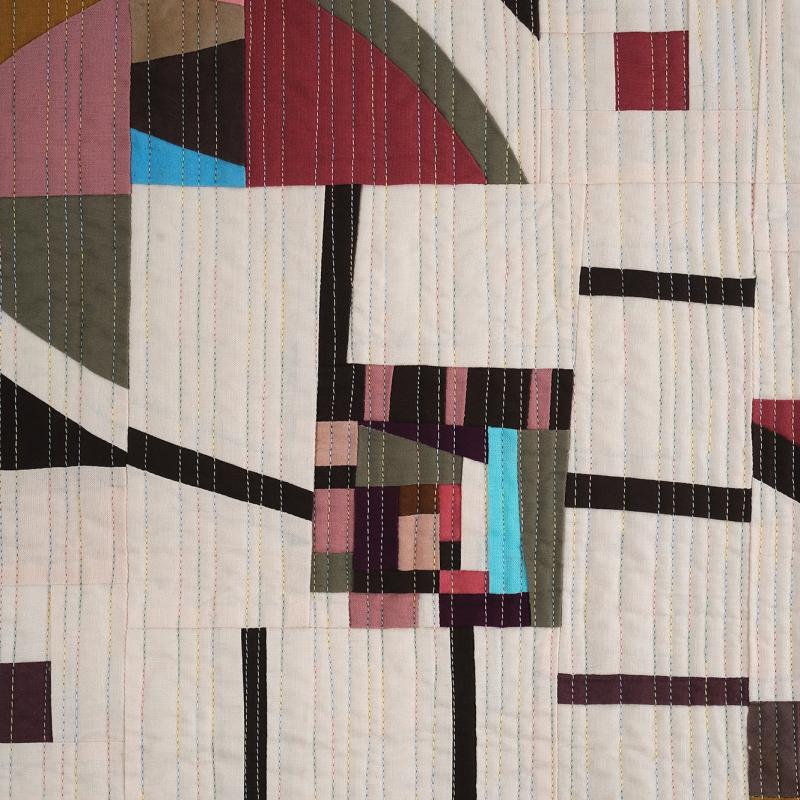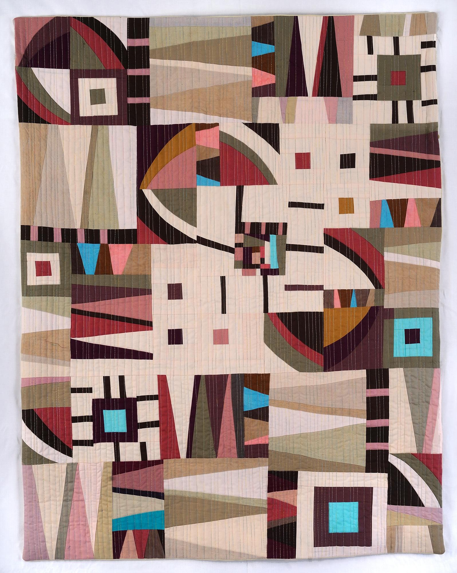 Neapolitan is part of a series of improvisationally designed quilts that use solid colors to explore line and shape. The contrast between light and dark values gives an illusion of depth that changes with each viewing. Creating lines and shapes directly out of fabric is liberating, engaging me in a dialogue with my materials. The final touch is the texture created by the vertical stitching lines, pulling the composition into a cohesive whole.