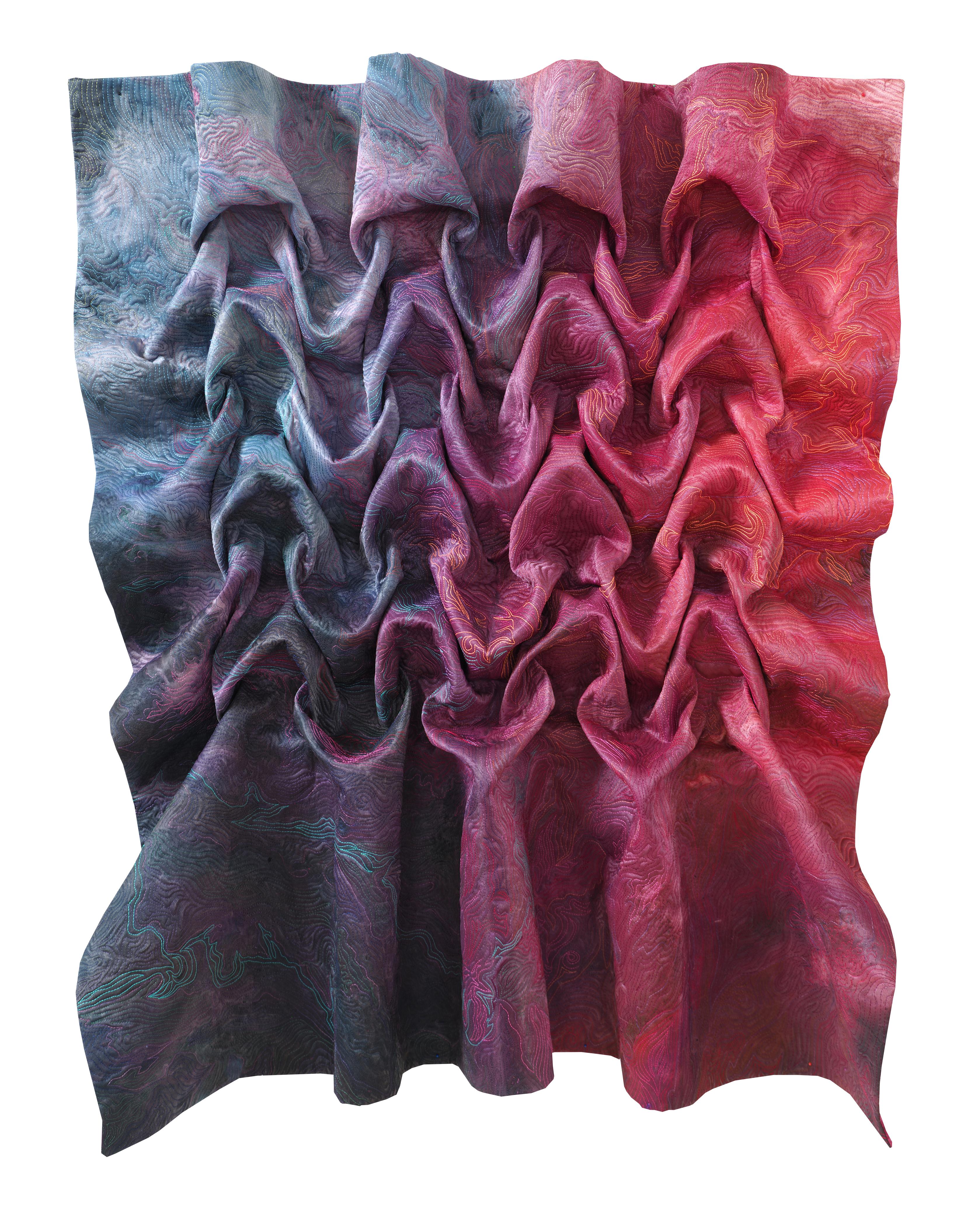 Orchestral music fills me with overflowing emotion. This piece is part of a series that explores how musical components mesh together to provide a multi-faceted experience. Rhythmic repetition, here manifested in shape and form, provides both a stable base for additional layers and forward movement. Flowing color evokes a joyful melody, and details of stitch and thread echo the complex and multi-dimensional sound of many instruments playing in balance.