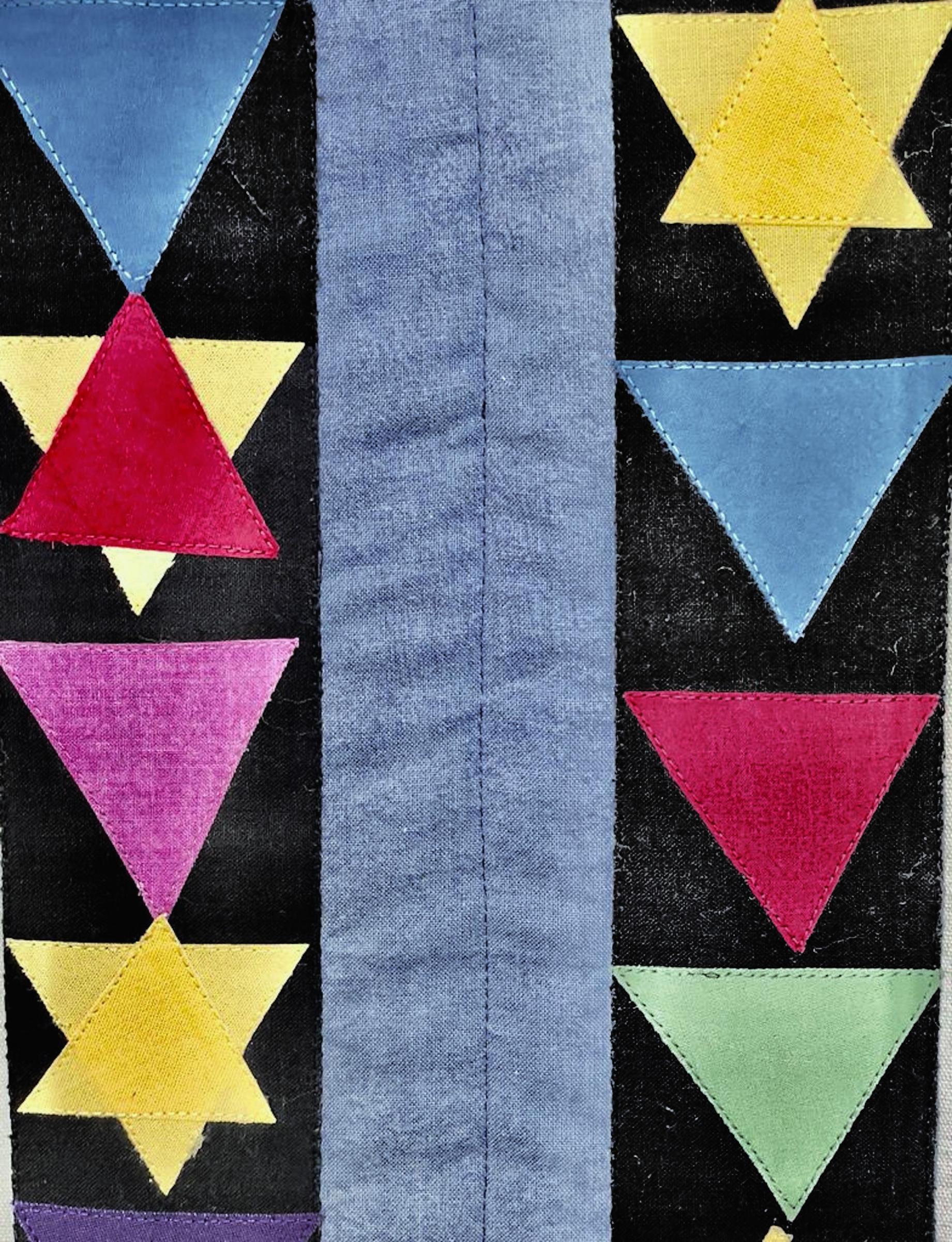 In the 17th century Citadel in Besçanson, France, four execution posts bear witness to the 100 resistance fighters who were executed there between 1941-44. Its Musée de la Résistance et de la Déportation details the somber story of occupation, imprisonment, resistance, and deportation to the concentration camps. In this piece, four black posts are set against the blue and white stripes of the concentration camp uniforms. They are decorated with the colored, triangular insignia used to classify different kinds of prisoners—Jews, political prisoners, criminals, Jehovah’s Witnesses, homosexuals, and others. Over 11 million people died. Never again, they said, but genocide continues in the world today.