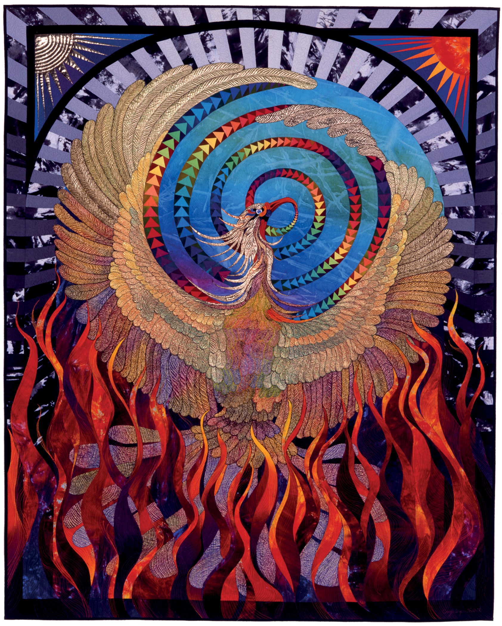 The phoenix itself is made from a variety of iridescent and metallic fabrics. The eye is made of laser foil, and changes color as the viewer moves from side to side. The long tail of the phoenix is intertwined with the flames, which have consumed the old phoenix, and from which the new phoenix is rising. As the phoenix rises from the flames, it is about to fly through a portal of black white and grey, toward clear skys and unlimited possibilities beyond. In the corners of the portal are a golden sun and a fire colored sun. These represent energy that can be either nurturing or destructive. Our choice.