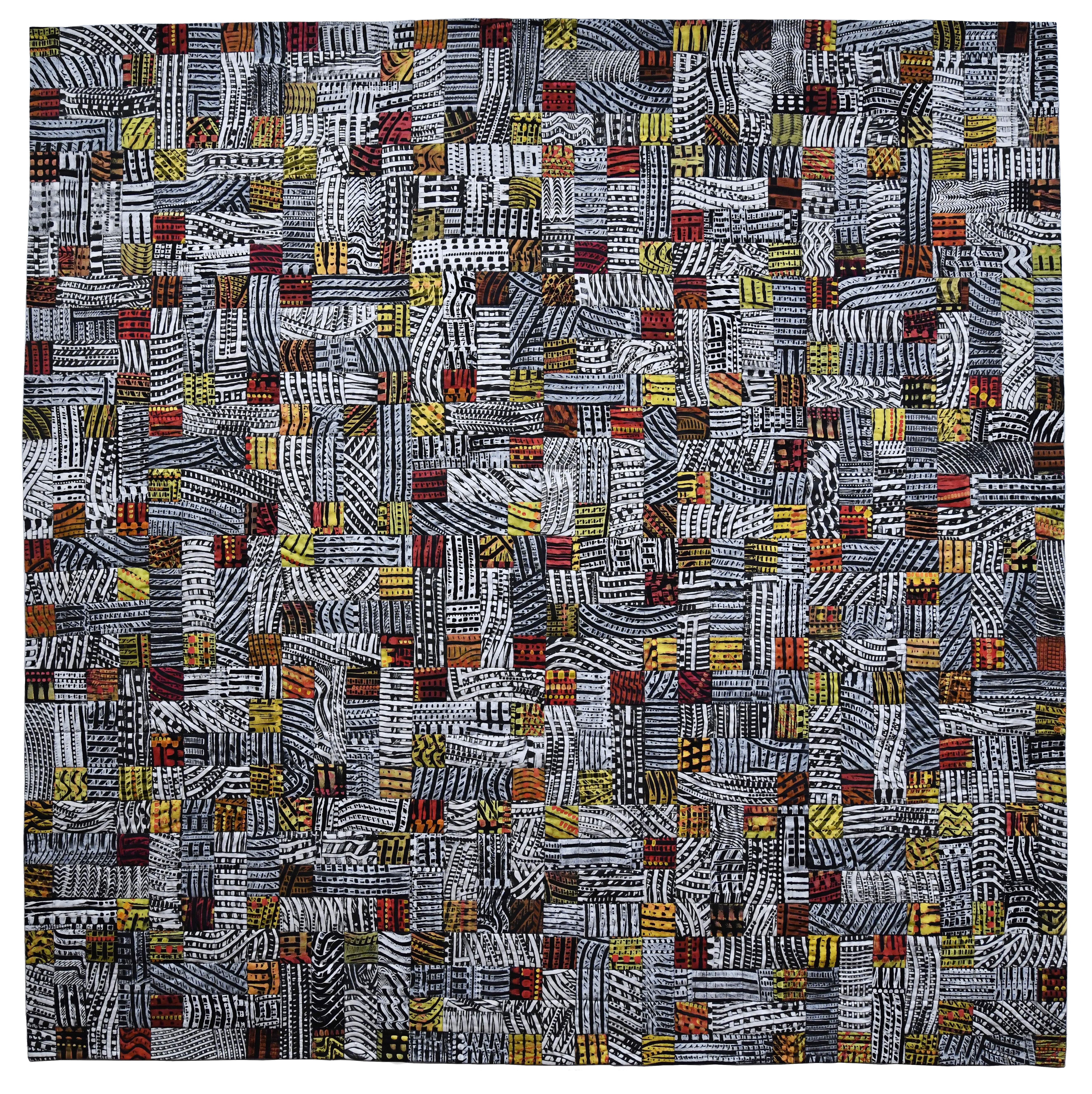 All fabrics were created by the artist through direct printing and monoprinting using a Plexiglas plate, fabric paints and marking tools. Machine pieced. Machine quilted.