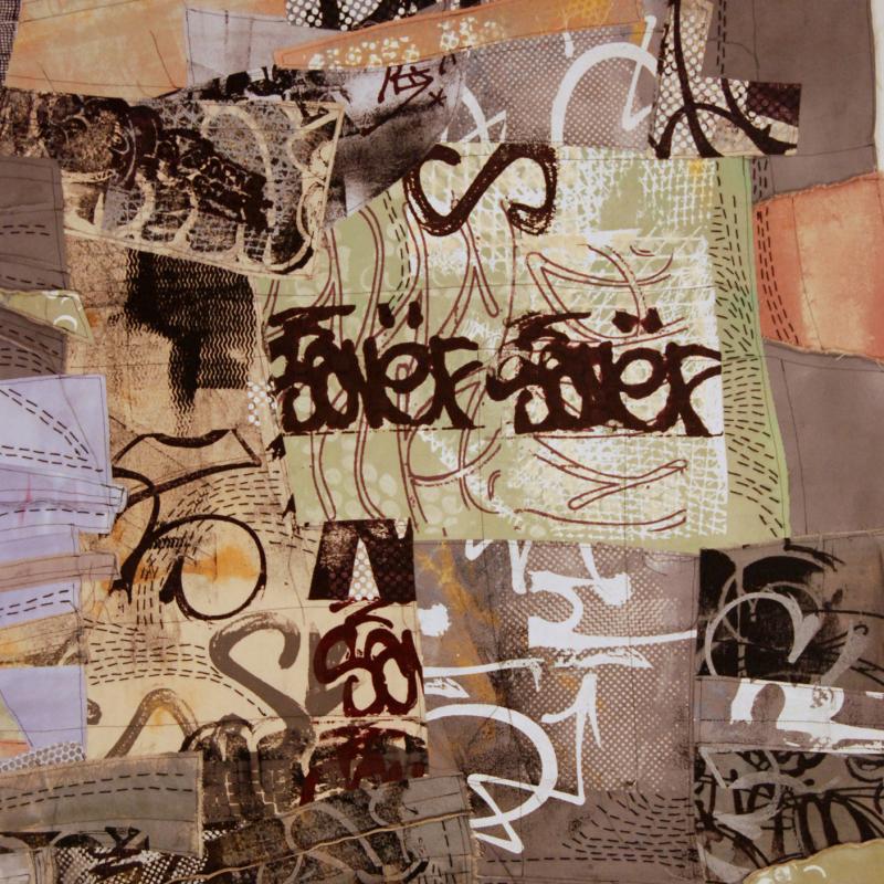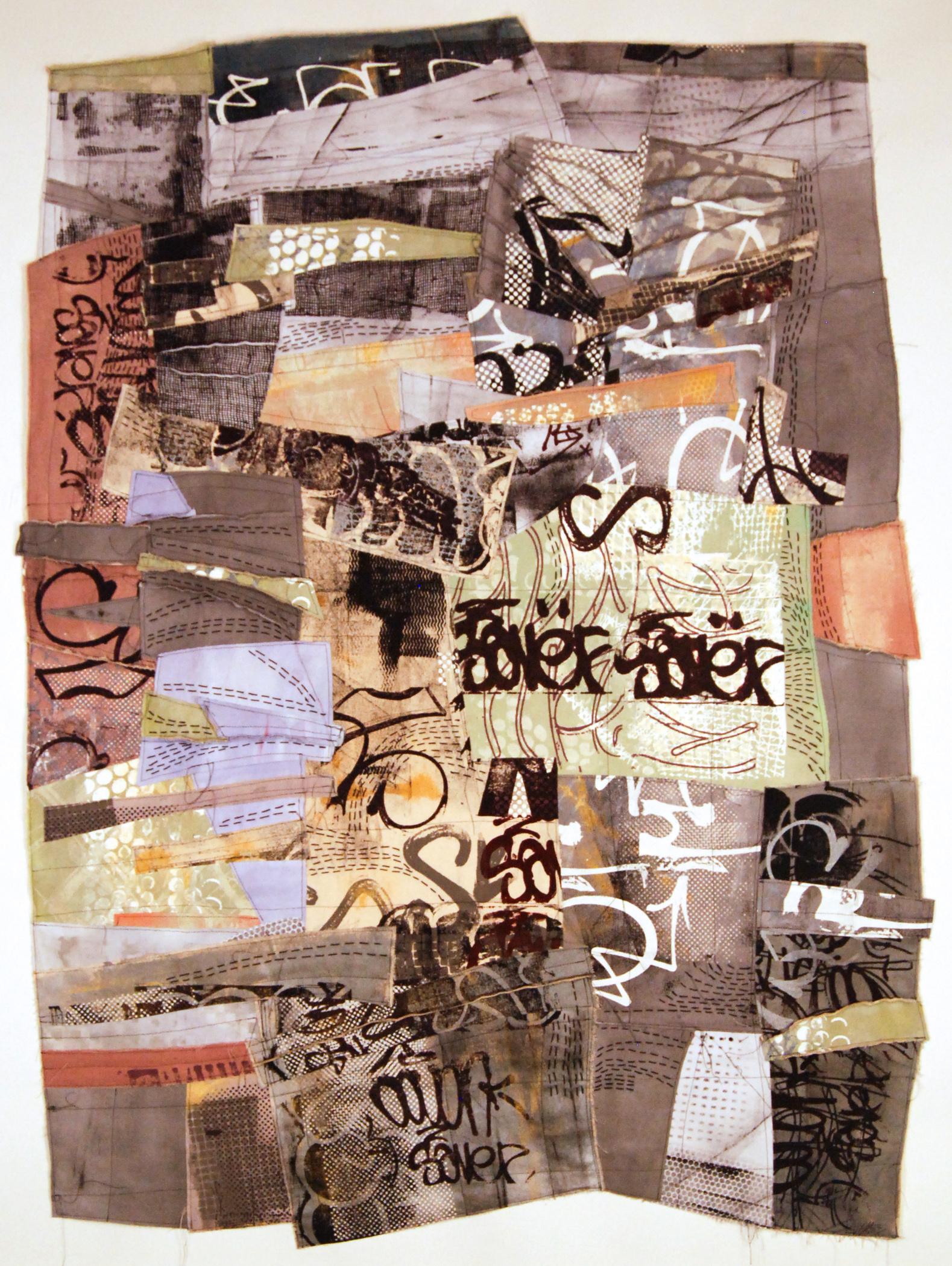 This reflects on my love affair with New York City. I have photographed graffiti all over the city and then manipulated it on the computer and made silk screens . Painting and overpainting to get the results that I want and then silkscreen printing over to create this conversation with the city of my birth.