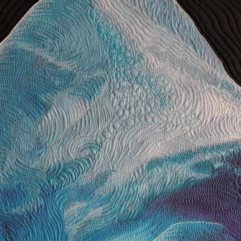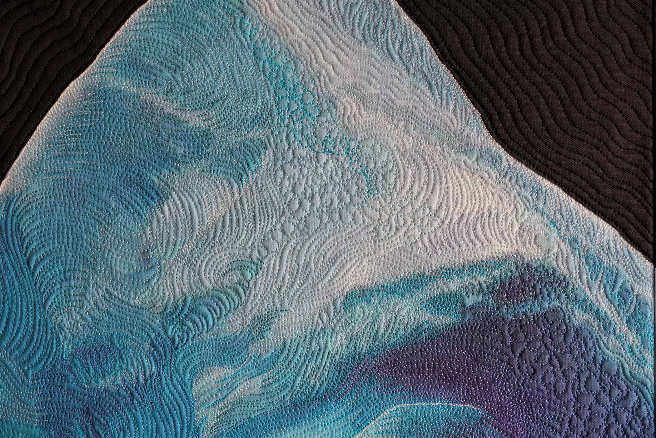 In February of 2020, I was part of a photography expedition to Antarctica. As our zodiac boats floated among the towering icebergs, our repeated request to the expedition leaders was to find us some “nice ice.” It was like floating through a museum of gigantic modern art sculptures. This was the first of my “nice ice” photographs which I chose to interpret. The black and grey sky adds contrast, and I exaggerated the shadows and contours of the ice. My piece is heavily thread painted with many different colors and values of aqua, blue, and violet.