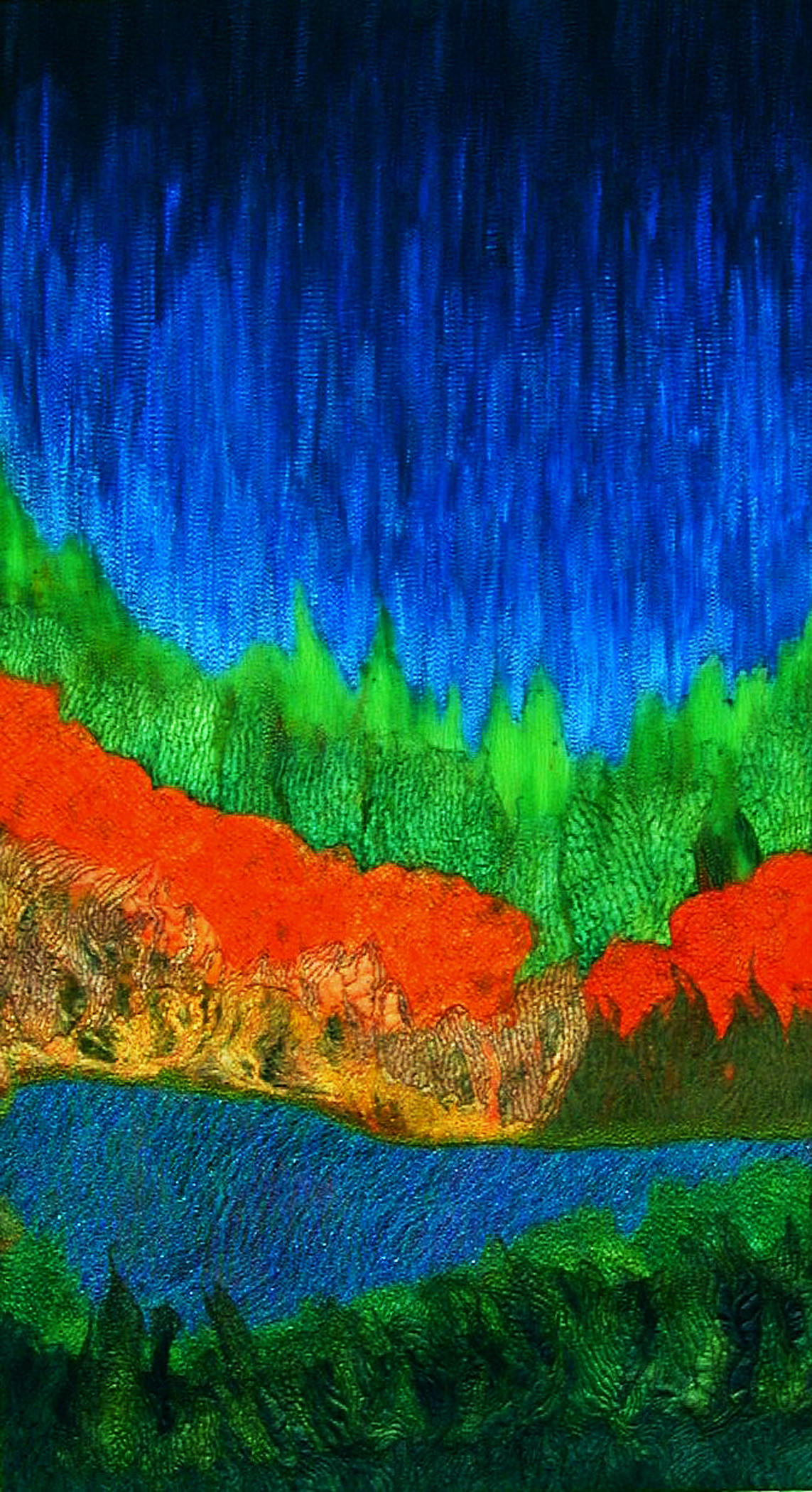 Night Falling is the third in a series of 20 works that explored using hand-made silk paper and other fibers in an applique-like process. I love the luminosity and texture provided by these materials. This piece represents that rare moment-within-a-moment that captures the essence of nightfall. That instant when the day bows its head to the glorious coming of evening's magic.