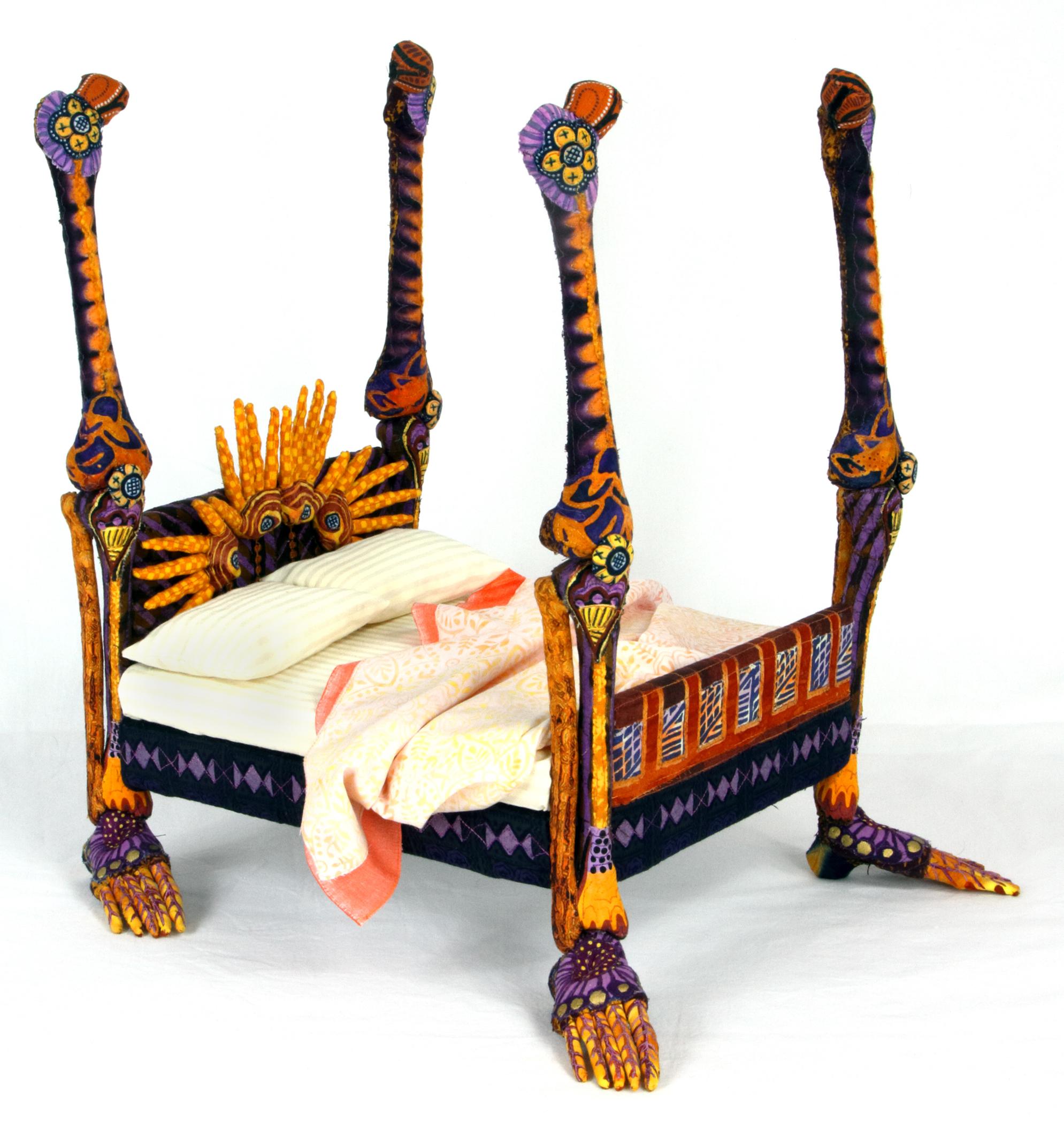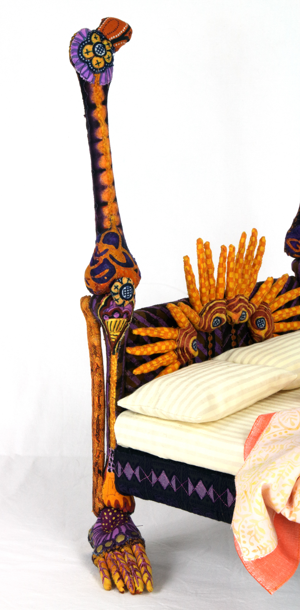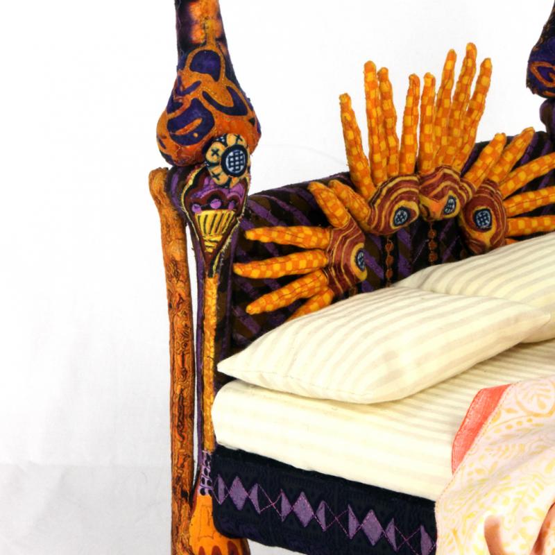 “Night Night," is from a recent series called Heirlooms, a group of domestic objects (house, rocking chair, bowl, platter, garden, dresser) incorporating cloth-covered plastic bones. Bones are a powerful symbol that evoke human mortality as well as human history and ancestry. This series examines daily life in the context of human fragility. How do objects and attitudes passed down in families embody the people who came before us? In a sense, we all live in houses created by our ancestors, and our descendants will live in structures created by us.