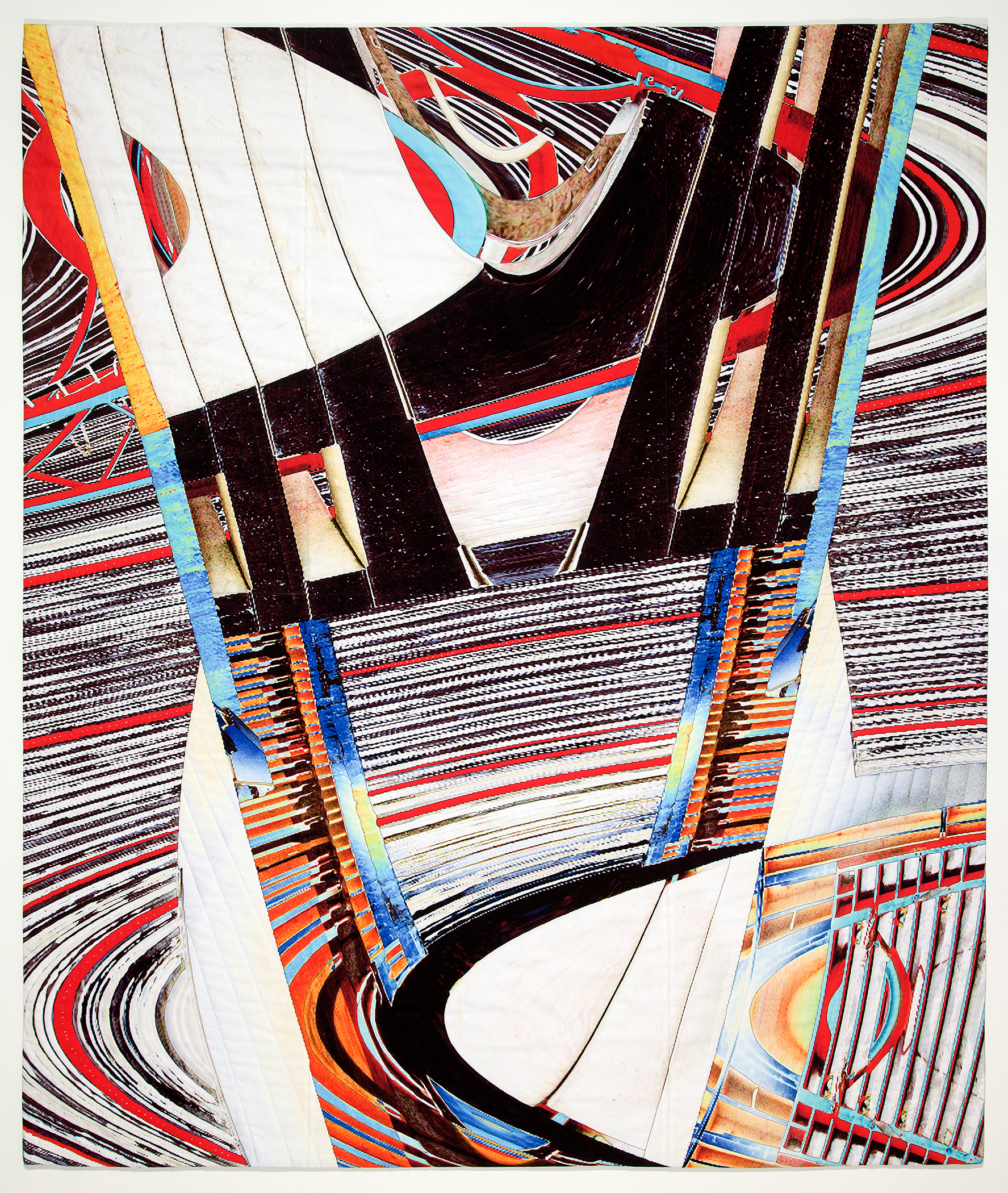 By the time I created No Exit I was really using stitch as a bas-relief element in work which I considered to be a textile painting or, more accurately, print. I was no longer using commercially available fabrics but instead was inkjet printing my original abstract compositions on paper-backed cotton using computer-altered photographic elements derived from my own photographs.