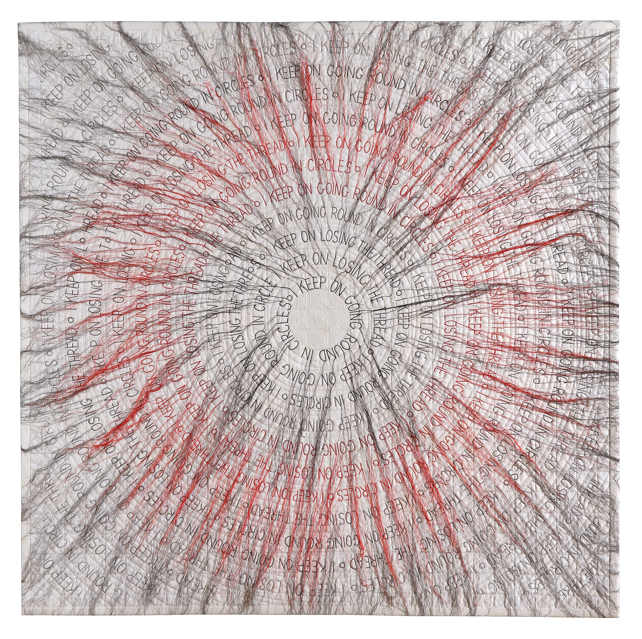 A quilt to suggest mental confusion. The threads are left unfinished to obscure the lettering. Two sentences are repeated throughout: 'I keep on going round in circles' and 'I keep on losing the thread.' I wanted to convey the frightening loss of control that Alheimer's sufferers must experience. Despite attempts at order, chaos keeps breaking out. The loose threads and the concentric circles echo the text.