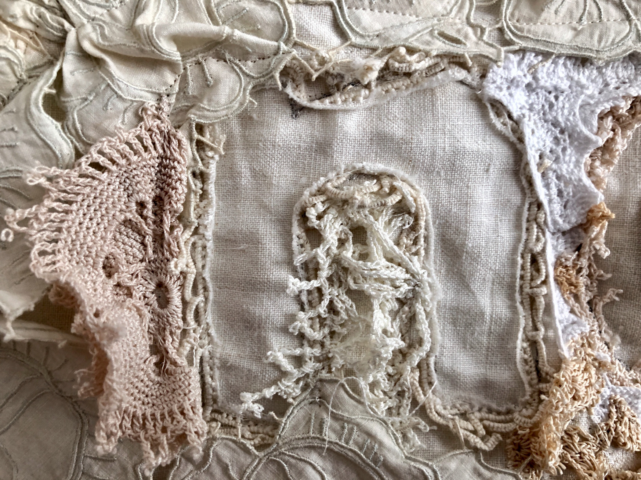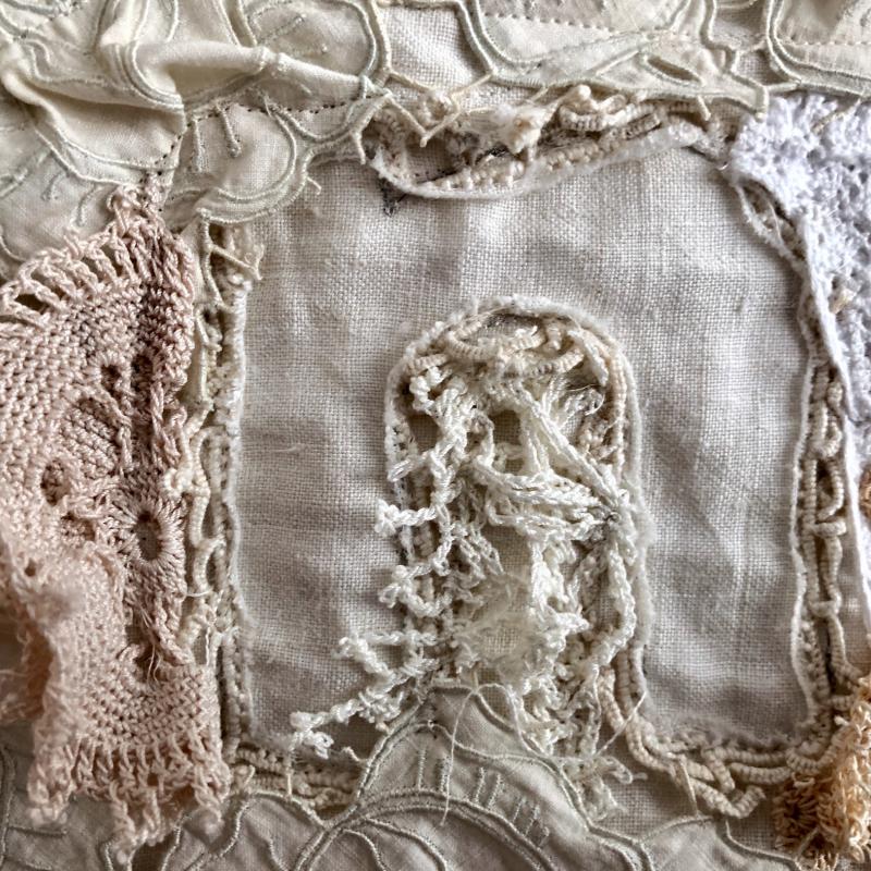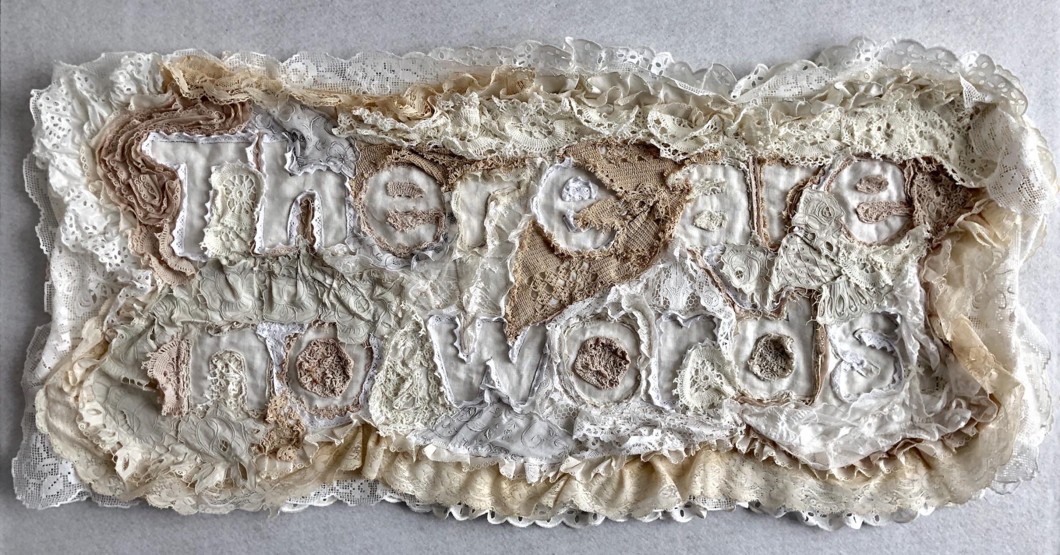 In offering condolences, we may begin, “There are no words.” How true this was for me. My son's death required expression. Stitching vintage textiles to make words out of negative space conveys the many-layered, messy, never-ending task as I deal with an irreplaceable and devastating loss and the complexity of my grief. The words on this quilt are difficult to see due to the lack of contrast and the wavy texture surrounding them, forcing others to struggle to grasp for words just as I do.