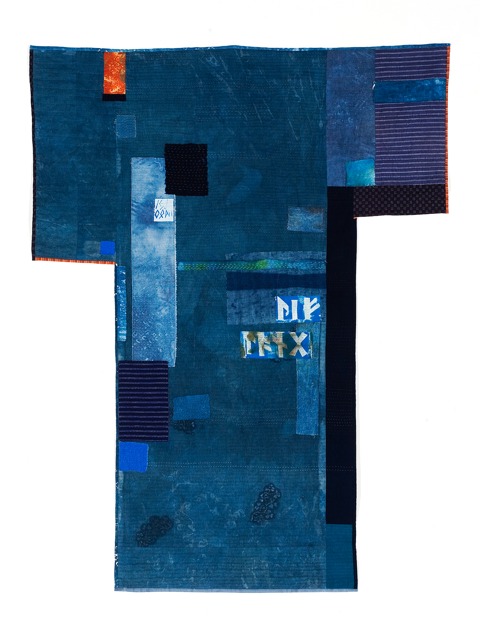 I am Danish with a love for the Japanese concept of wabi sabi. In this piece I wanted to combine Japanese and Scandinavian aesthetics. The shape is alluding to kimonos, but it is also very similar to a dress found in a Danish grave from the Bronze Age. The color blue is well known from the use of indigo for Japanese cotton cloth but also from Scandinavian peasant cloth. The patching and recycling - I had just discovered the Japanese Boro tradition in 1998 - is found in both culture, and I imagined that this 'coat' with Rune letters could have been worn by a shaman during the Viking Age.