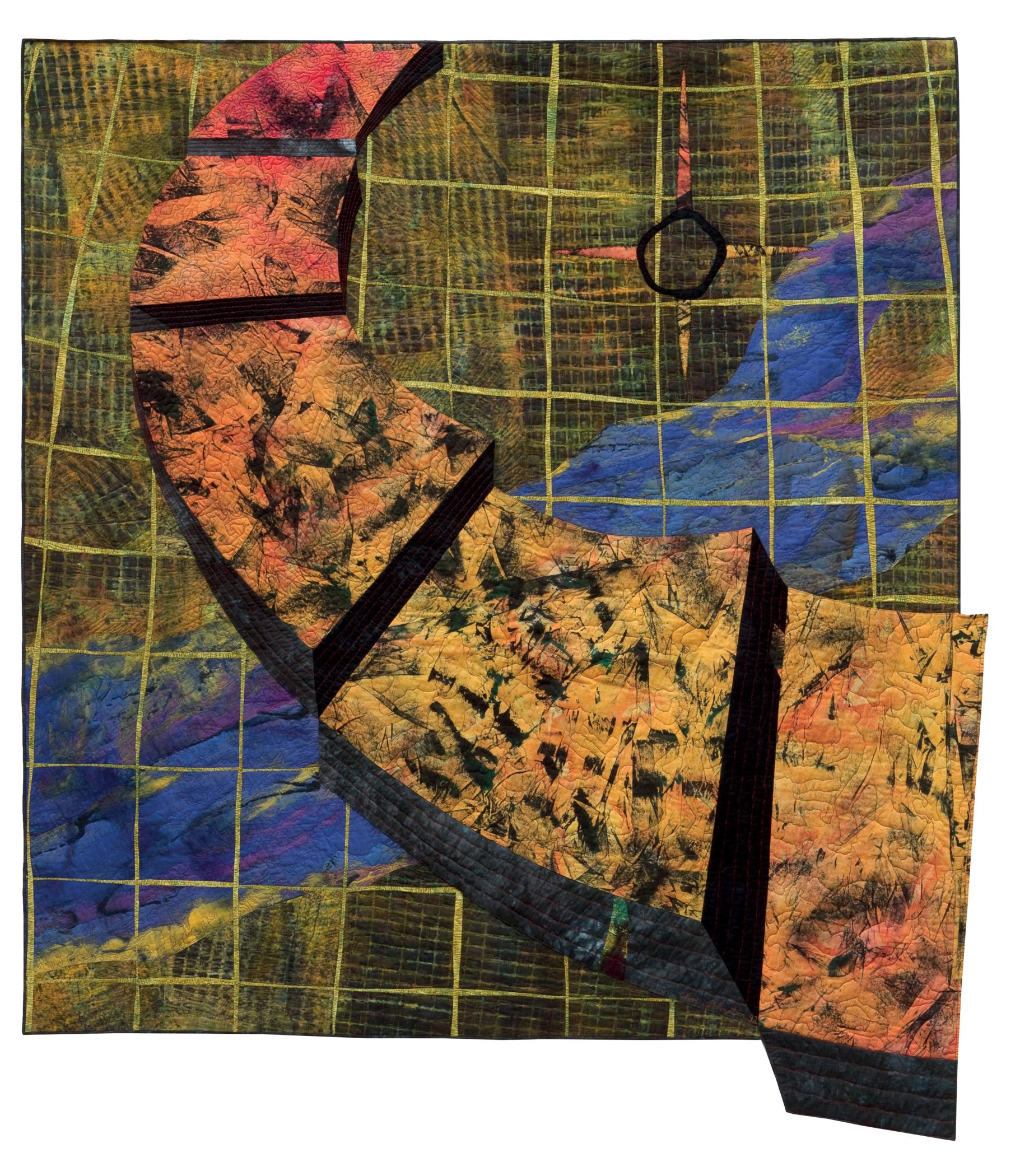 This is one in a series I called Sketch Maps. North is Up refers to one of the many standard mapping expectations. I was working on new ways to put pieces together and practicing my freemotion machine quilting.