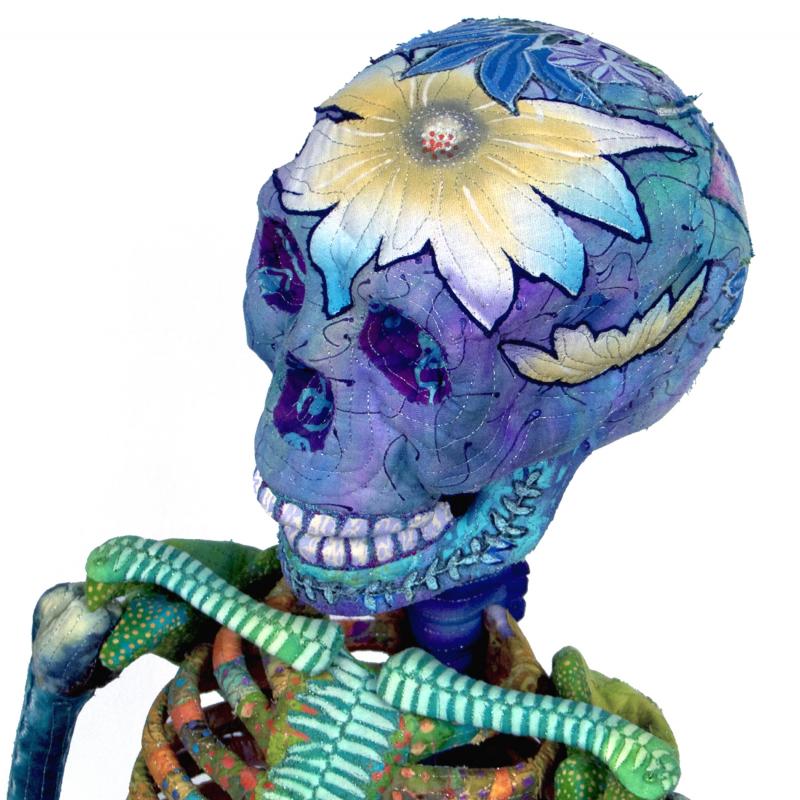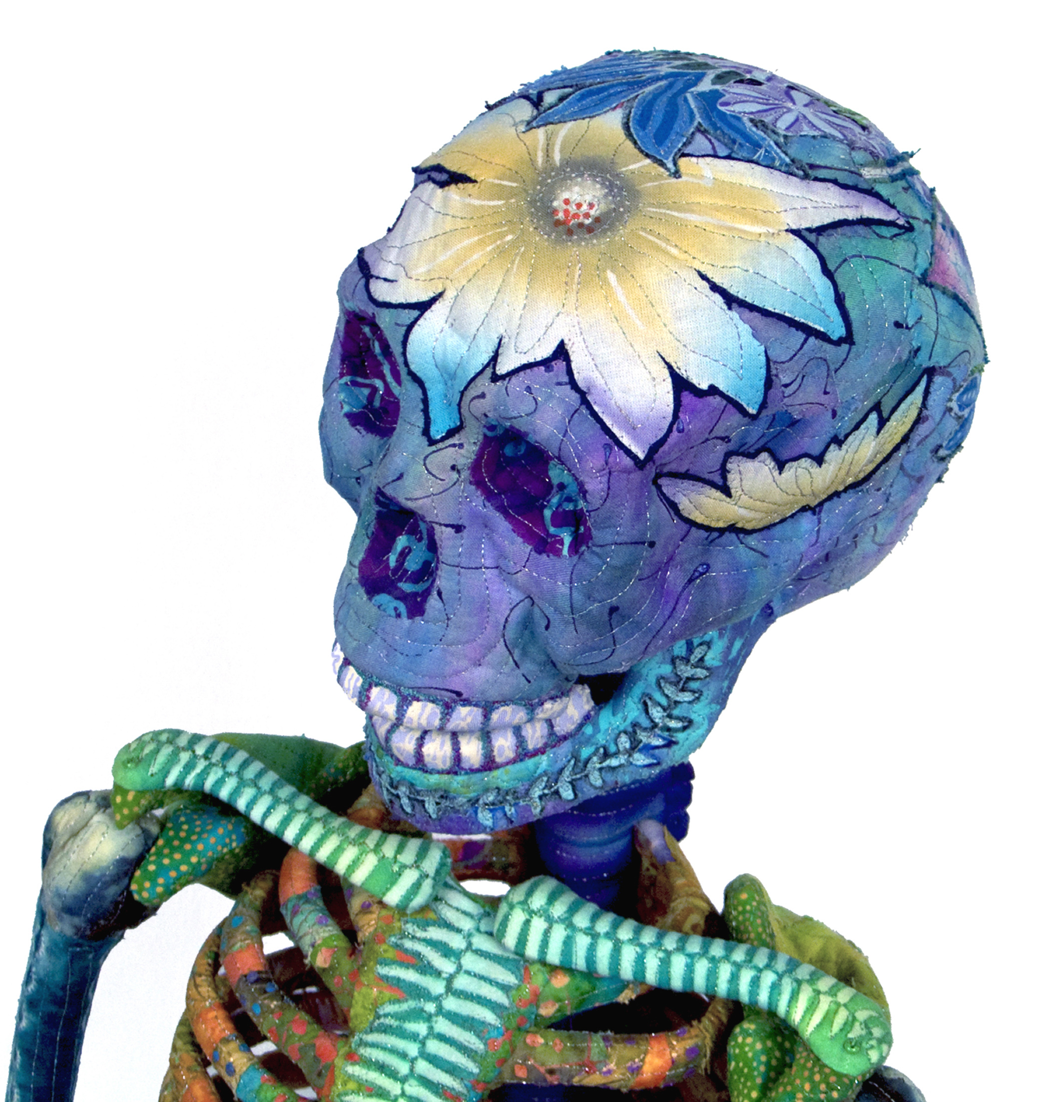 Nothing to Fear is the first in my Mortality series, These gestural skeletal figures conflate opposites: joy and grief, cloth and bones, the fleeting moment and the ultimate end. The benign gesture runs into the primal fear associated with skeletons, and all are covered in an exuberant blooming surface of collaged and quilted cloth. The piece was completed in 2008 and caused a stir at Quilt National in 2009.