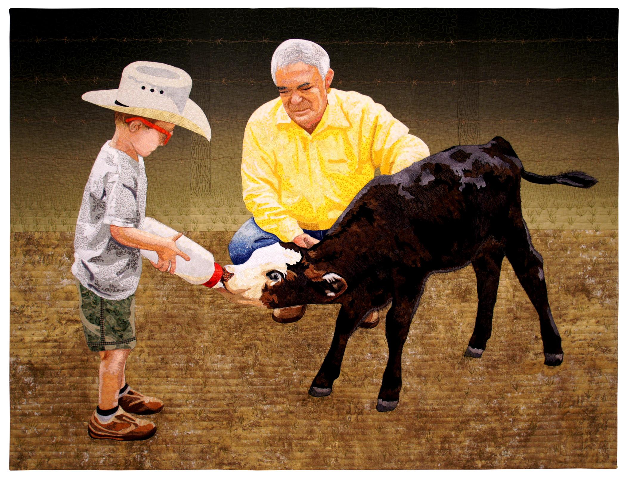 This quilt is based on a photo I took of my husband showing our grandson how to feed an orphaned calf. Our central Texas ranch has provided a refuge from our city lives. We have enjoyed many opportunities to share our appreciation of animals and nature, and these experiences have helped us form closer relationships with our children and grandchildren. My collaged figures place the focus on this loving interaction.