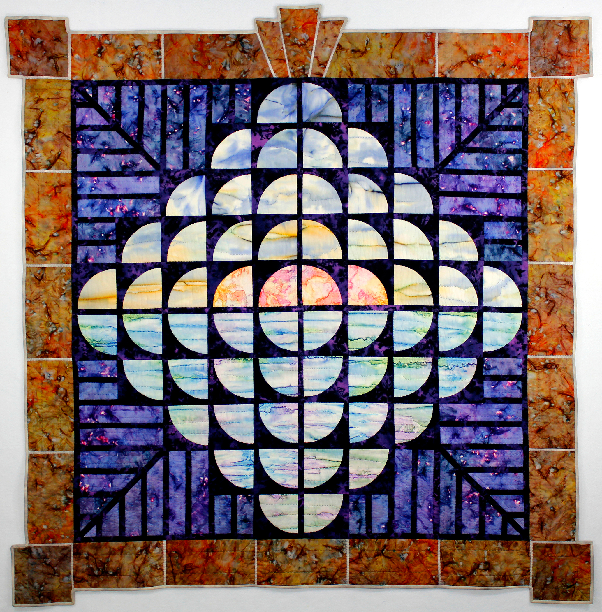 From my stained glass period, this was supposed to be a purely abstract design but the fabric choices dictated otherwise. This quilt taught me a lesson.