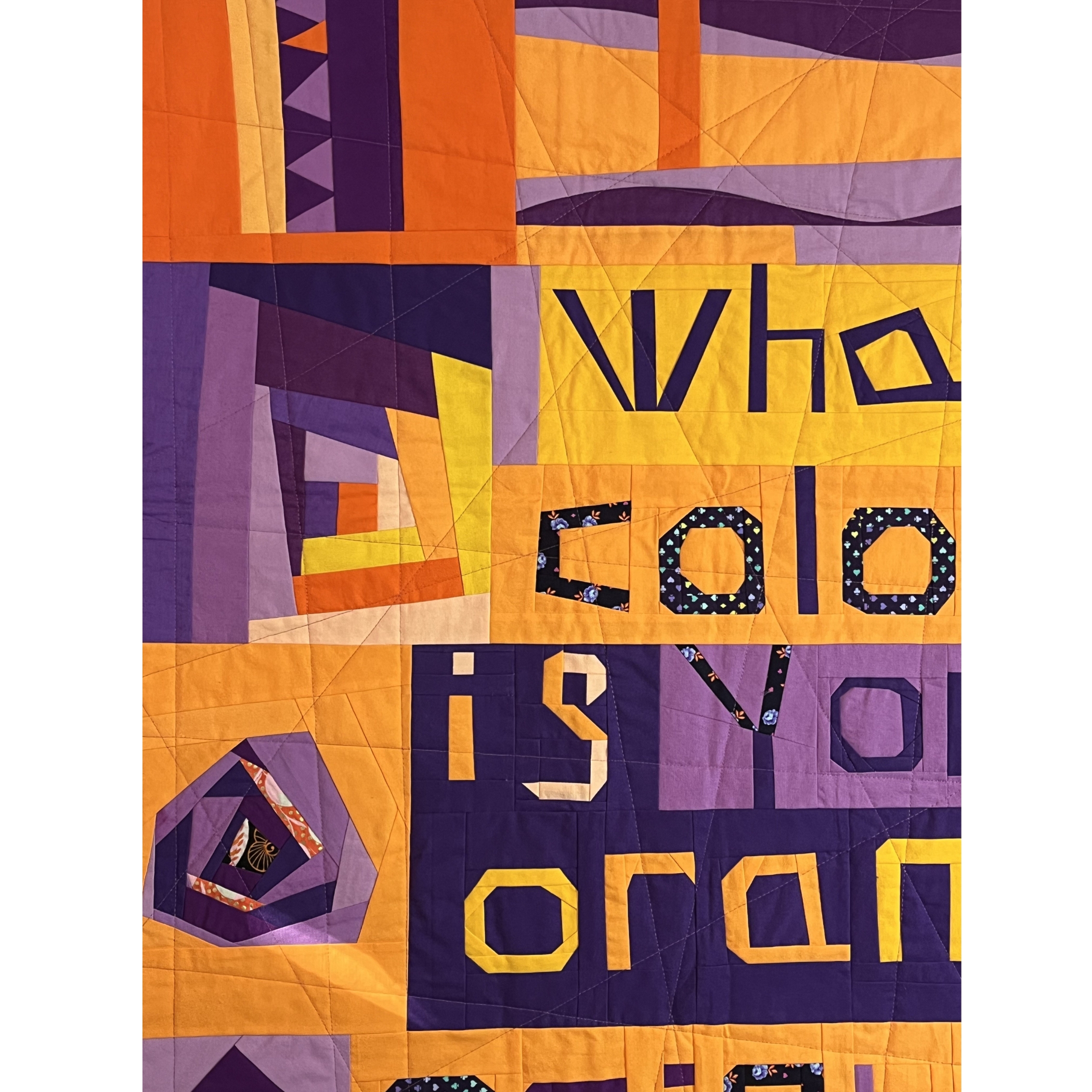 This quilt was made for an improvisational challenge, with one challenge to use improvisational letters. I remembered a phrase that was bantered around the art room in my 9th grade art class. The teacher was Mr. Gallagher and I’m not sure if he came up with the phrase, or if it was a student and we all just adopted it. “What Color is Your Orange Neighbor” was thrown into conversations randomly. I was never sure what it meant, but to me the meaning was “isn’t this a conundrum” or “life is absurd.” It’s stuck with me all these years and I remember fondly his class which delved into serious art techniques. Plus he was a young and handsome teacher!