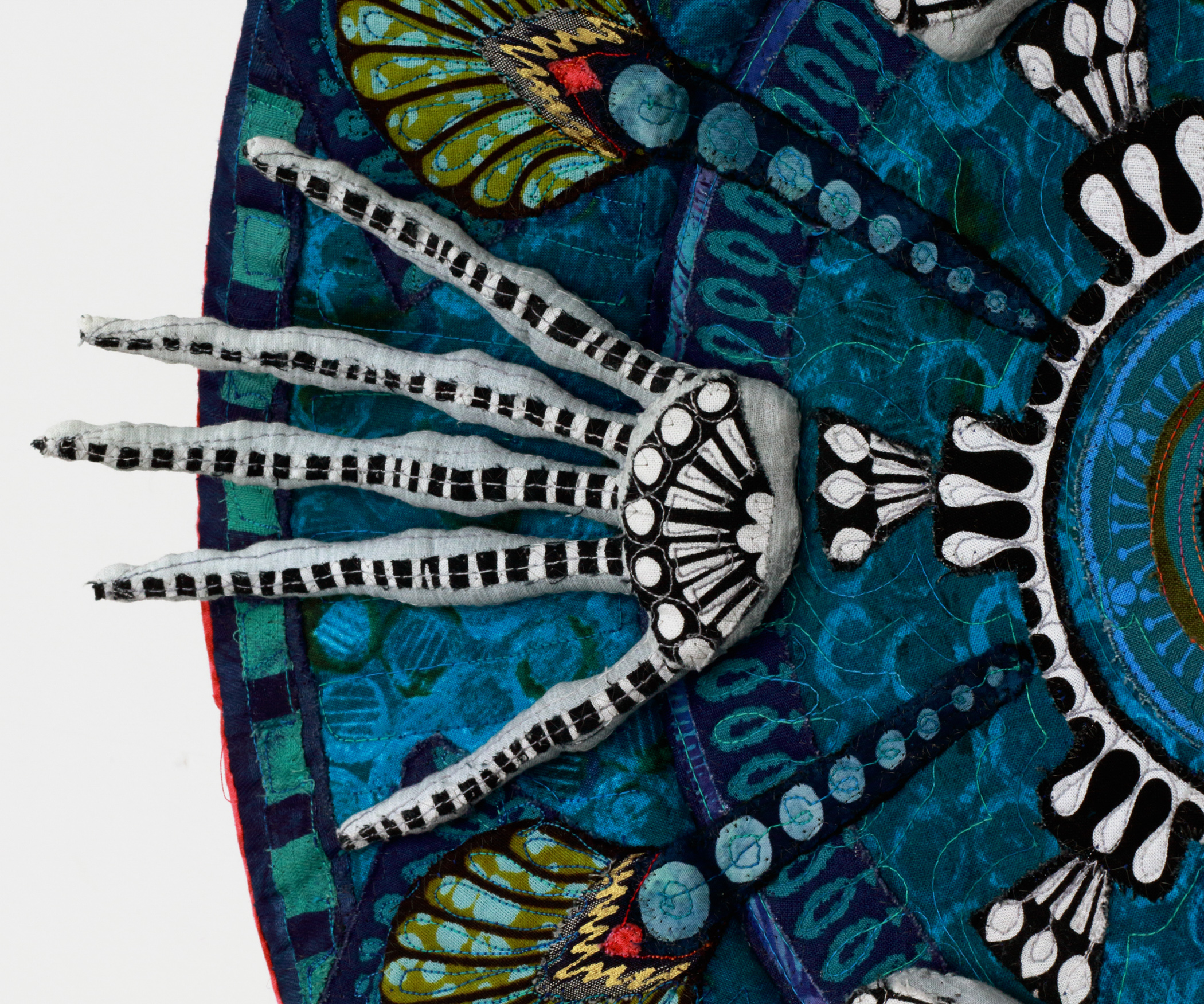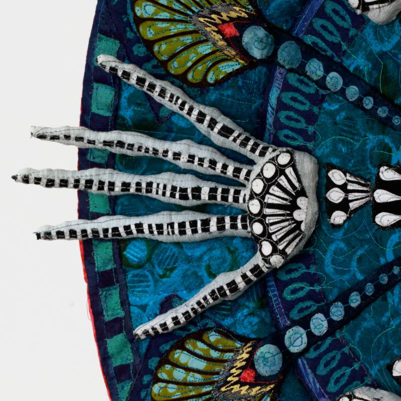 This textile platter incorporates cloth-covered skeletal hands. The work is part of of a series called “Heirlooms,” which examines the ideas of mortality, our human past, and the meaning of domestic objects handed down through generations.